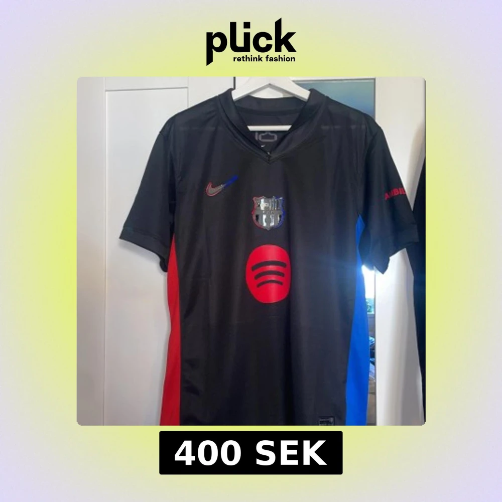 Säljer en svart FC Barcelona bortatröja från Nike med klubbmärke och sponsortryck på bröstet. Tröjan har korta ärmar, röda och blå detaljer på sidorna och är tillverkad i Dri-FIT-material. Den är helt oanvänd och säljer den för att jag köpte fel storlek.