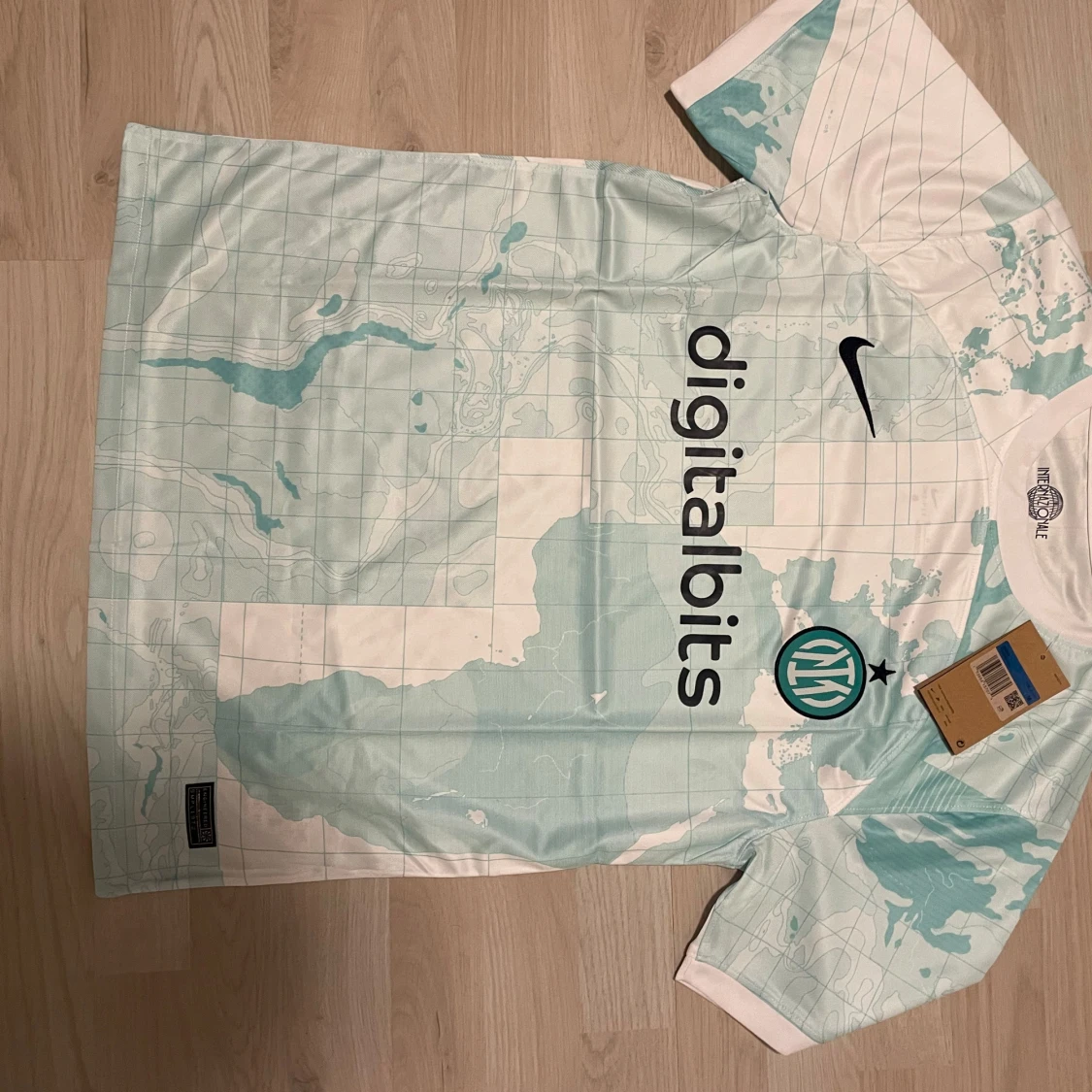 Inter Milan bortatröja 2022/23 från Nike. Vit bas med ljusblå kartmönster och svarta detaljer. Tryckta loggor för Inter, Nike, Digitalbits och Lenovo. Tillverkad i lätt och ventilerande polyester, perfekt för match eller träning.