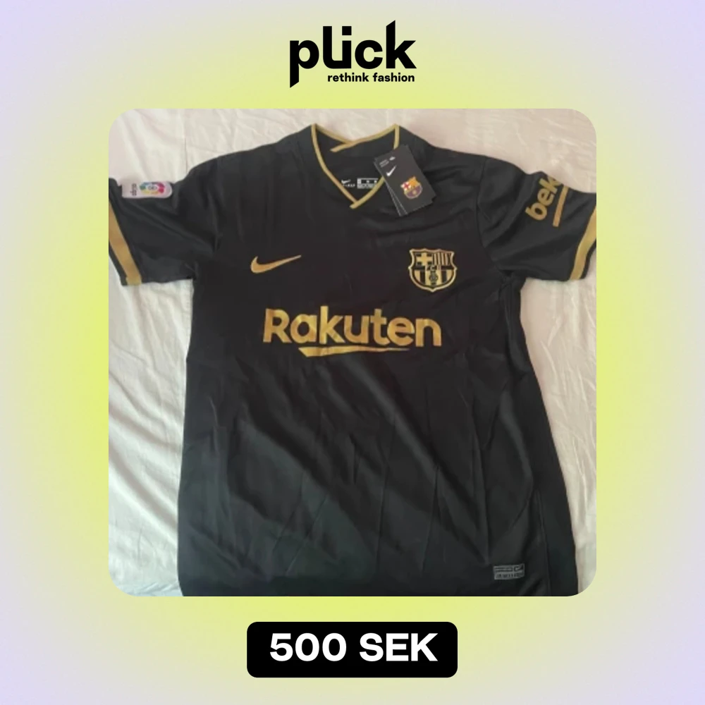 Säljer en snygg FC Barcelona tröja i svart med guldiga detaljer. Tröjan har korta ärmar och är i nyskick. Den har klubbens emblem och sponsorlogga i guld på framsidan. Perfekt för alla Barca-fans!