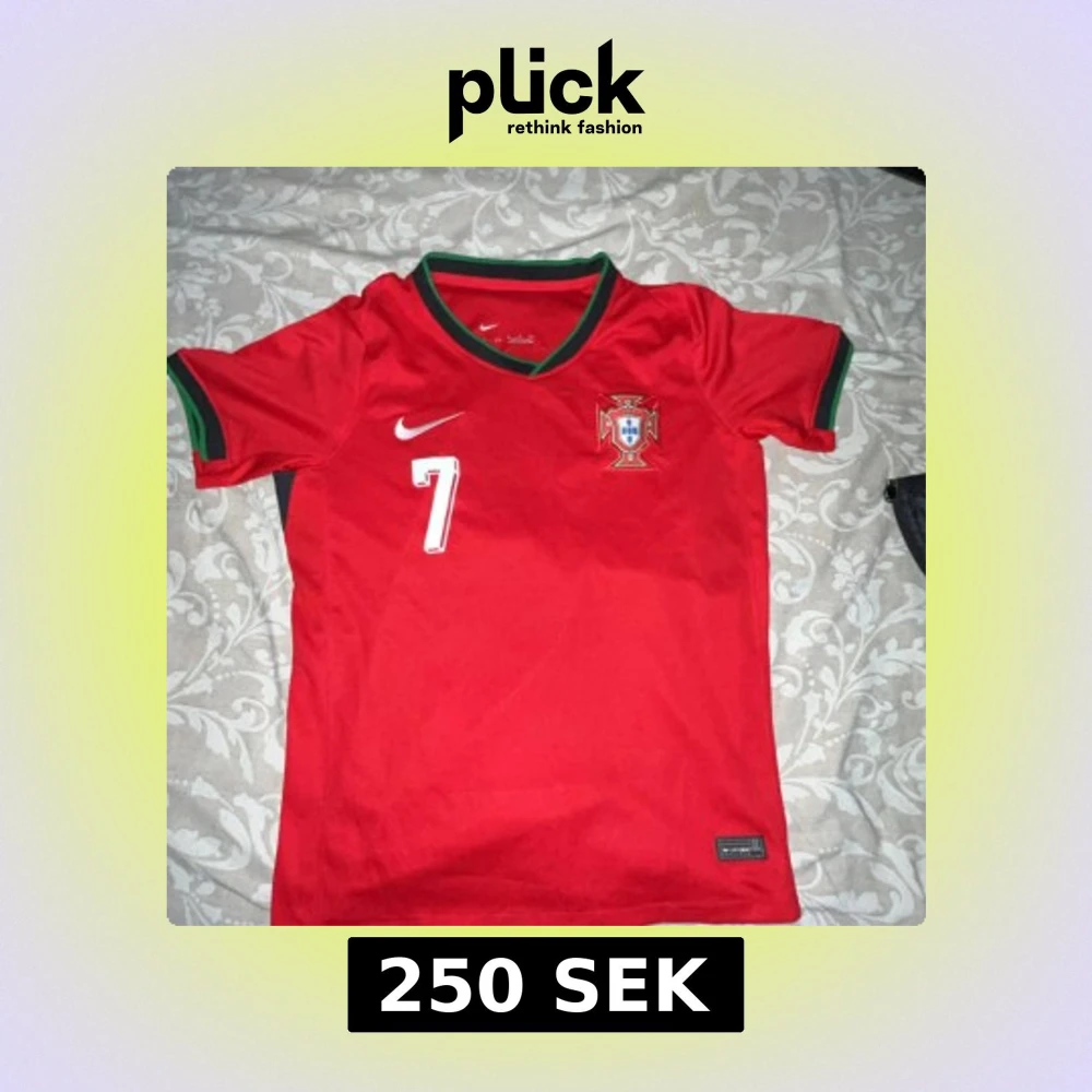 Säljer en röd Portugal fotbollströja från Nike med gröna detaljer vid krage och ärmslut. Nummer 7 och Ronaldo tryckt på ryggen, samt Portugals landslagsmärke på bröstet. Kortärmad modell i lätt och ventilerande material, perfekt för match eller träning. Kan diskutera om priset!