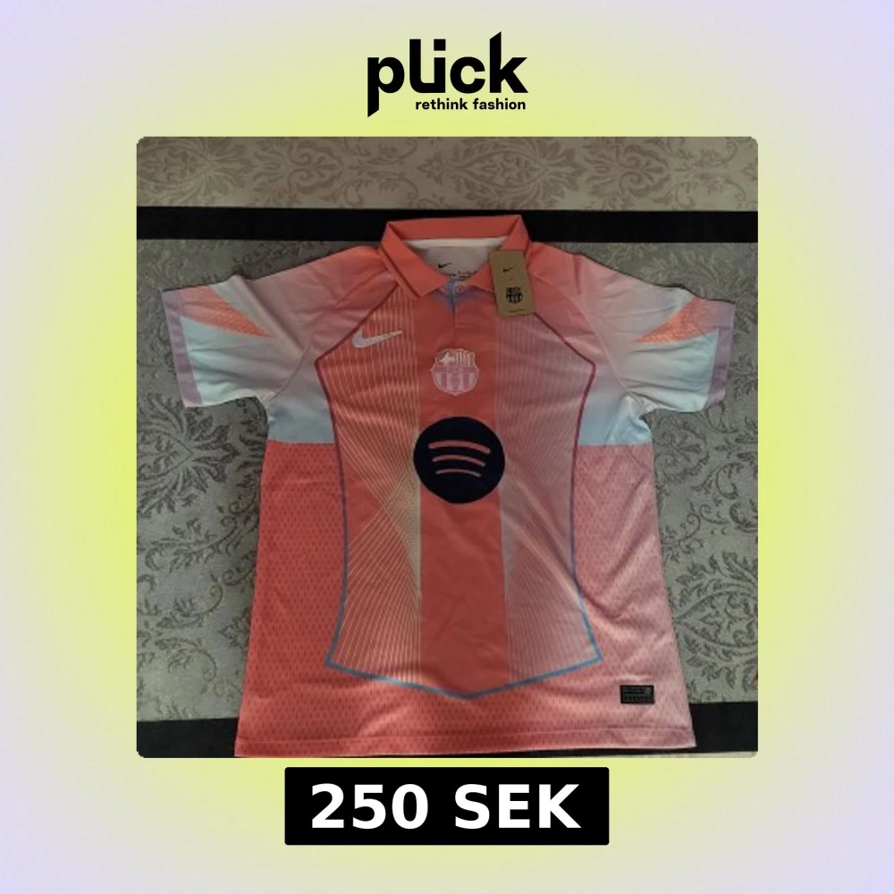 Säljer en FC Barcelona fotbollströja från Nike i storlek M med Lamine Yamal och nummer 10 på ryggen. Tröjan har korta ärmar, krage och är i rosa och ljusblå toner med vita och mörkblå detaljer. Materialet är lätt och andas, perfekt för match eller träning.