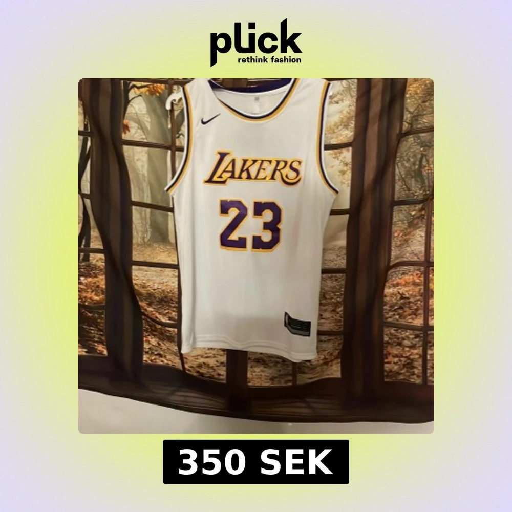 Säljer ett vitt basketlinne från Nike med Lakers-logga och nummer 23 i lila och guld. Linne har ärmlös design och är perfekt för basketfans. Detaljerad med spelarnamn på baksidan.