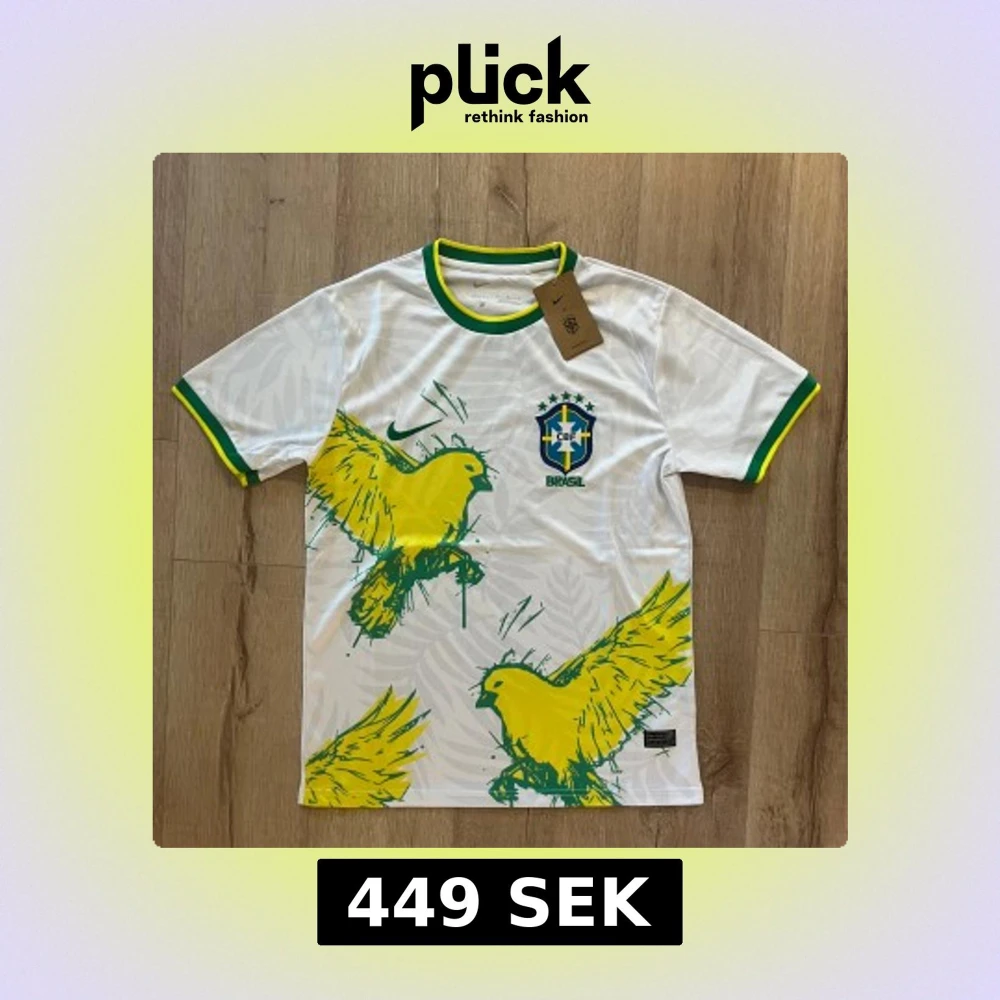 Snygg vit Brasilien fotbollströja från Nike med gröna och gula detaljer. Framsidan har stora gula fåglar och CBF-emblem på bröstet. Kragen och ärmsluten har gröna och gula ränder. Tillverkad i lätt och ventilerande polyester.
