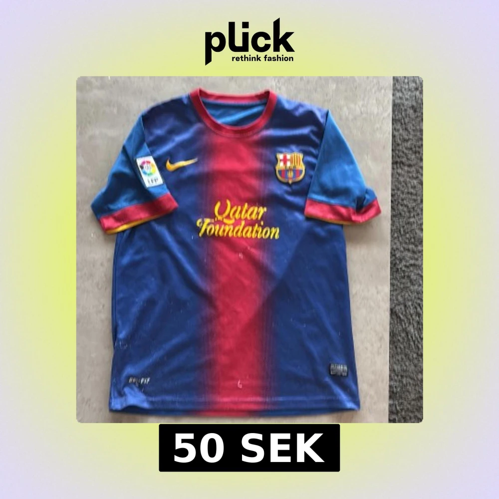 Säljer en klassisk FC Barcelona fotbollströja från Nike med Messi 10 på ryggen. Tröjan är blå och röd med gula detaljer och har korta ärmar. Perfekt för alla Barca-fans! 🏆