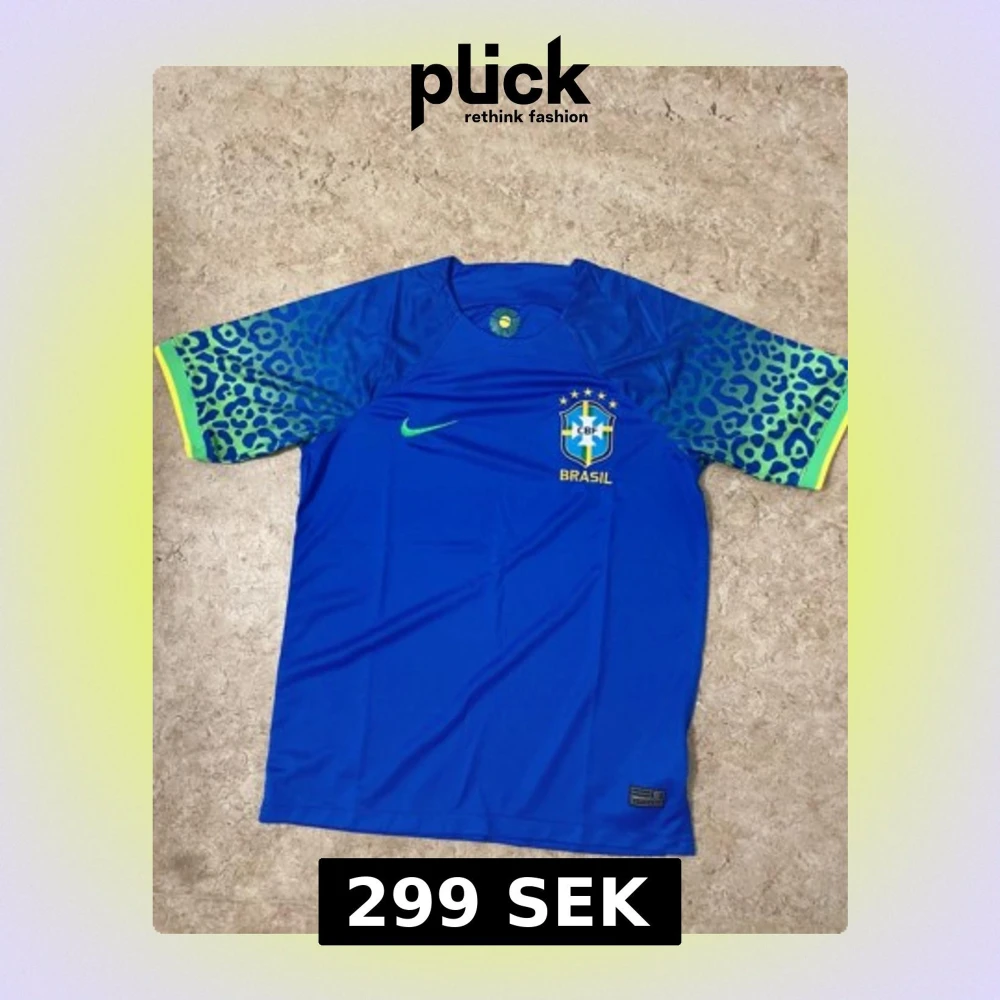 Snygg blå Brasil t-shirt från Nike med coolt leopardmönster i grönt och blått på ärmarna. T-shirten har korta ärmar, Brasil-logga och Nike swoosh på bröstet. Perfekt för fotboll och sportiga dagar. Materialet är lätt polyester som andas.