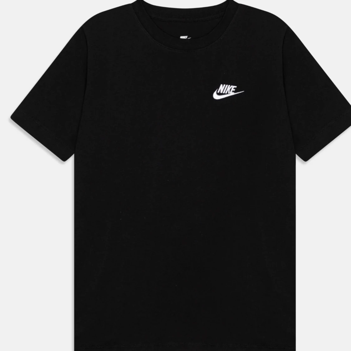En stilren svart t-shirt från Nike med klassisk vit logga på bröstet. T-shirten har rund halsringning och korta ärmar, perfekt för en clean och sportig look. Tillverkad i mjuk bomull som känns skön mot huden. Passar nån som ksk är runt 146-158 ish