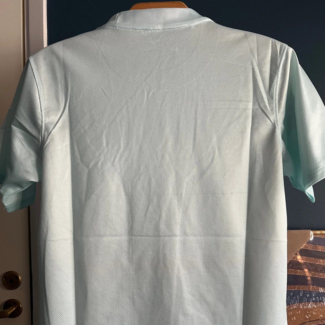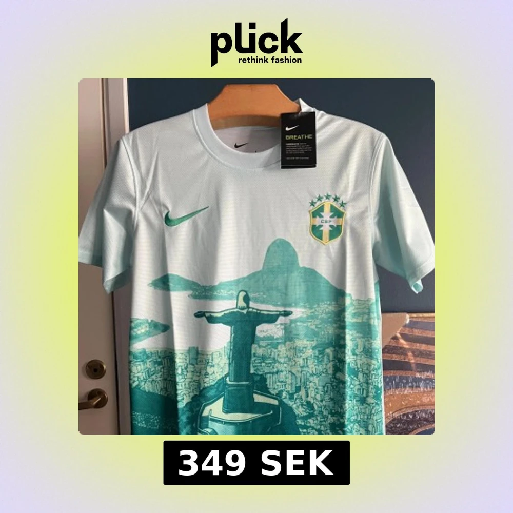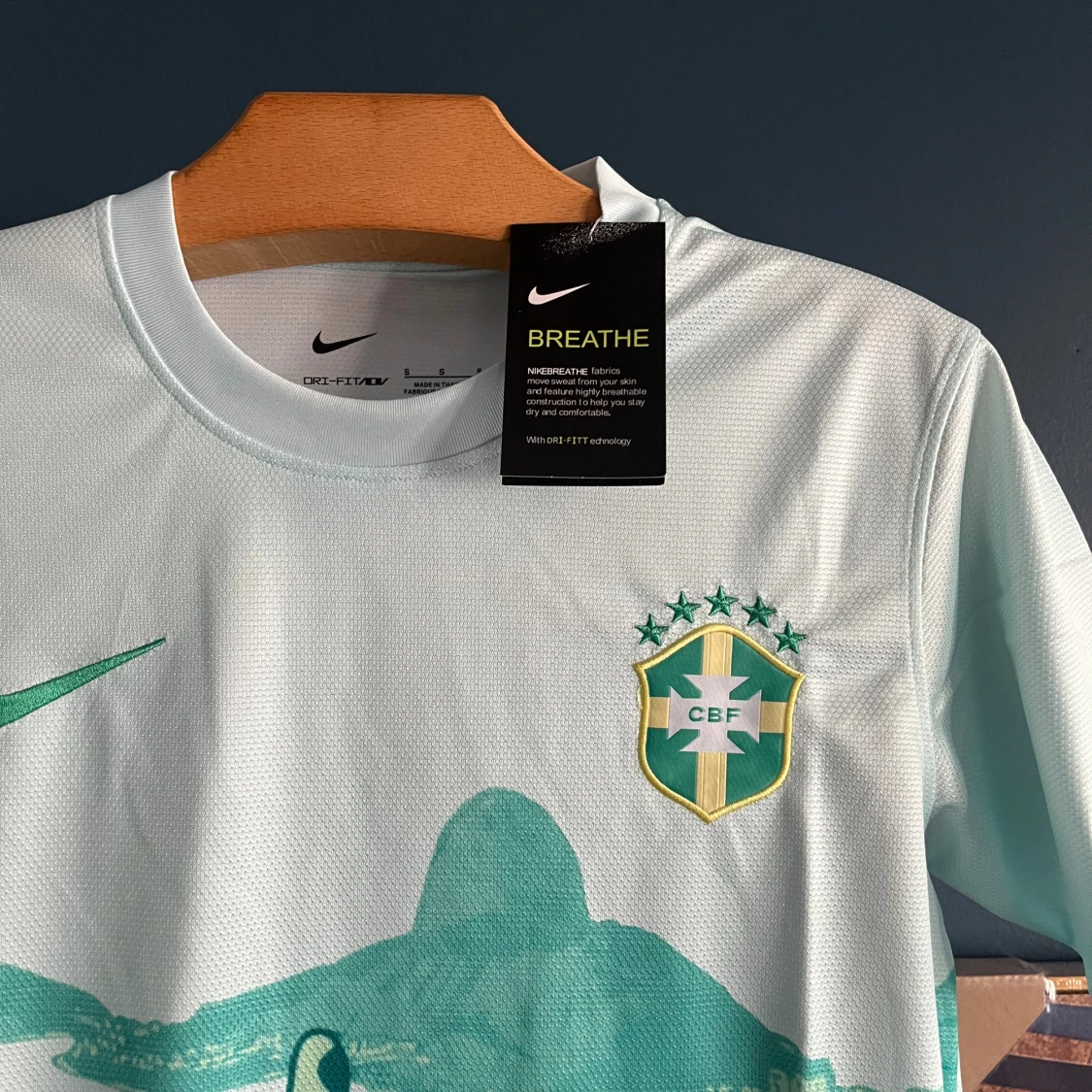 Snygg Brasilien fotbollströja från Nike i ljusblått med grönt tryck av Kristusstatyn och Rio de Janeiro. Kortärmad modell med rund hals och CBF-emblem på bröstet. Tillverkad i lätt, ventilerande Dri-FIT material som håller dig sval under matchen.