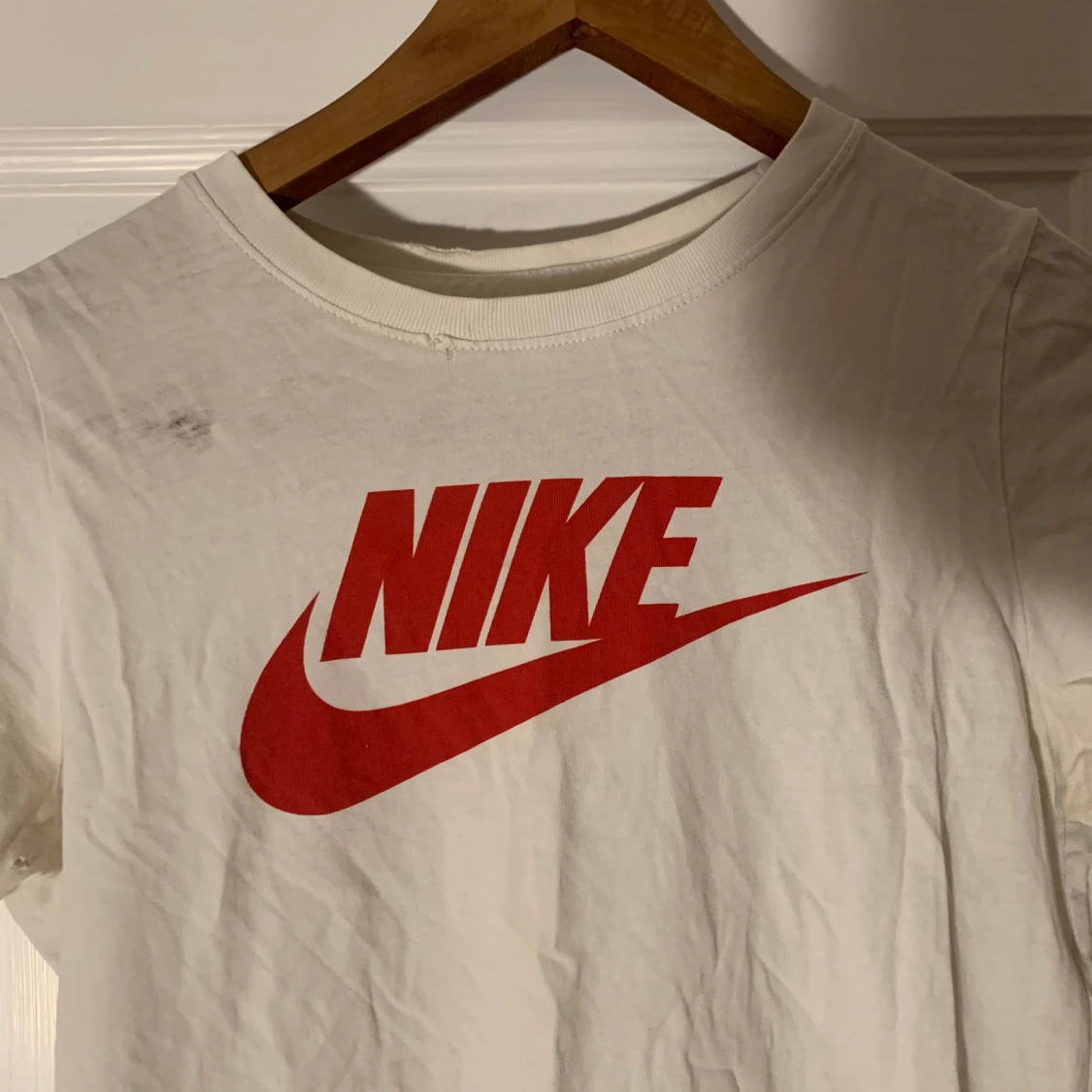 Vit Nike T-shirt med röd logga/swoosh i jätteskönt material. Strl XS. (Obs! Ser ur som en fläck vid bröstet på bilden men är som ett litet hål/tyget har blivit slitet där men syns ej när man har den på sig)