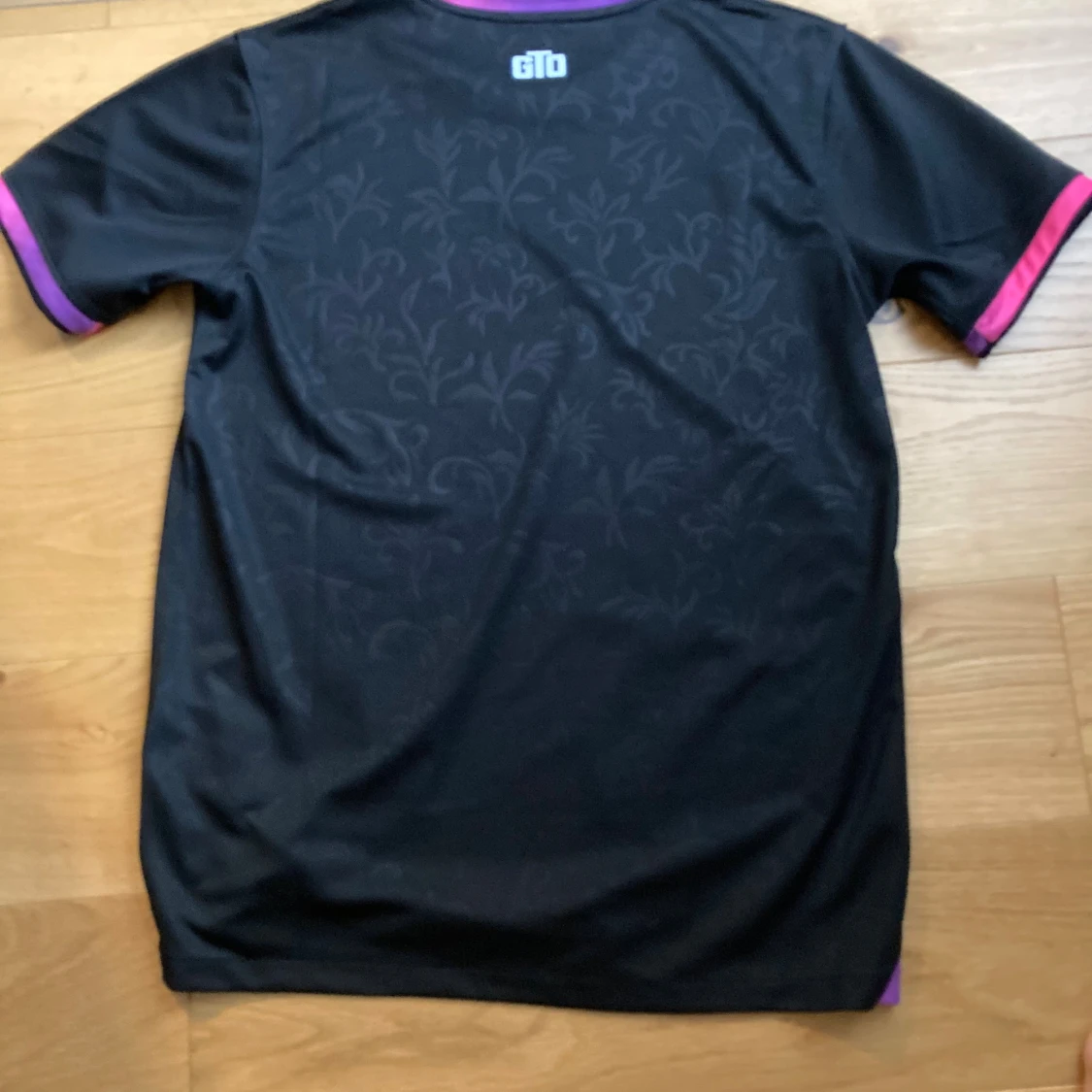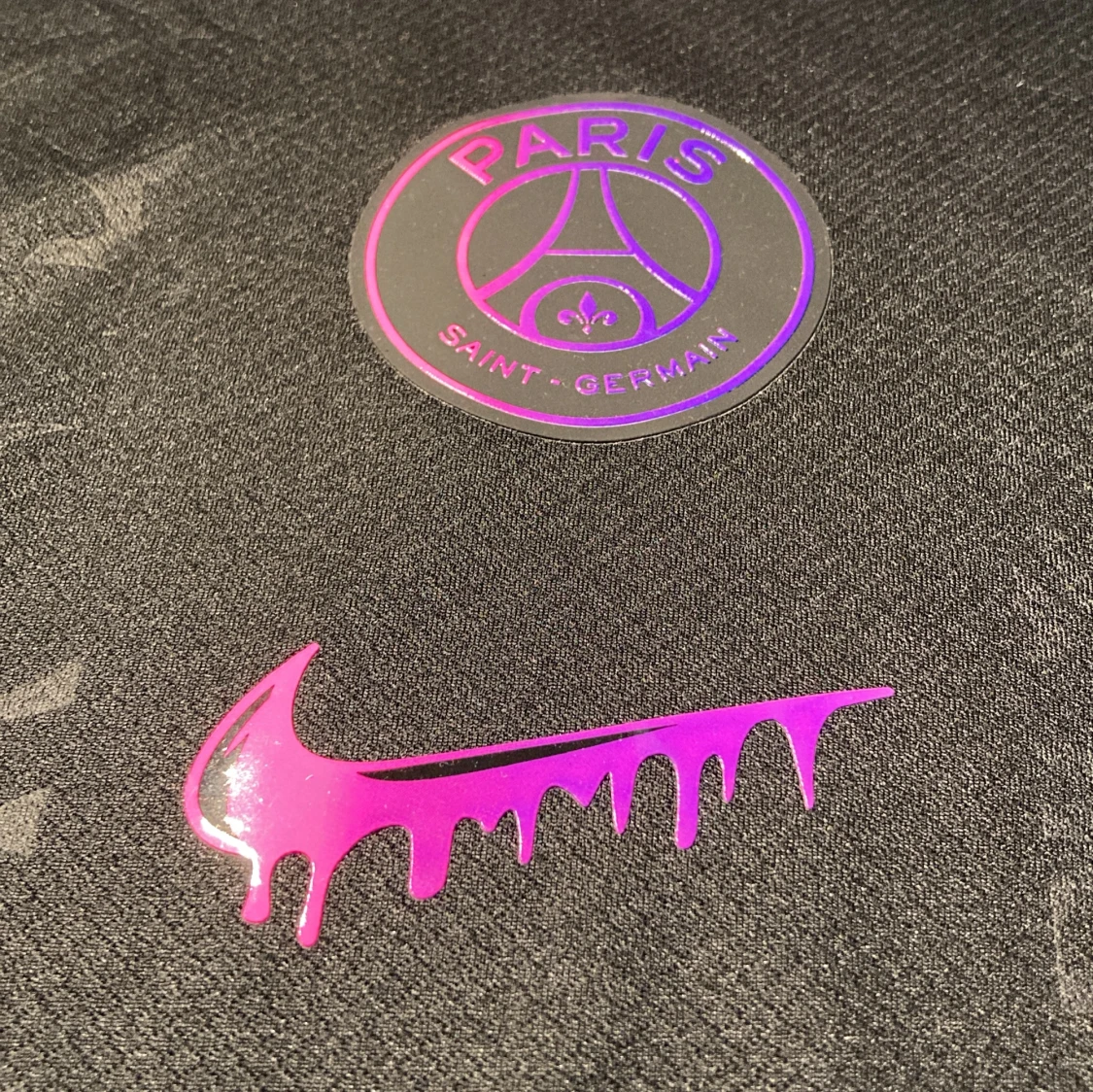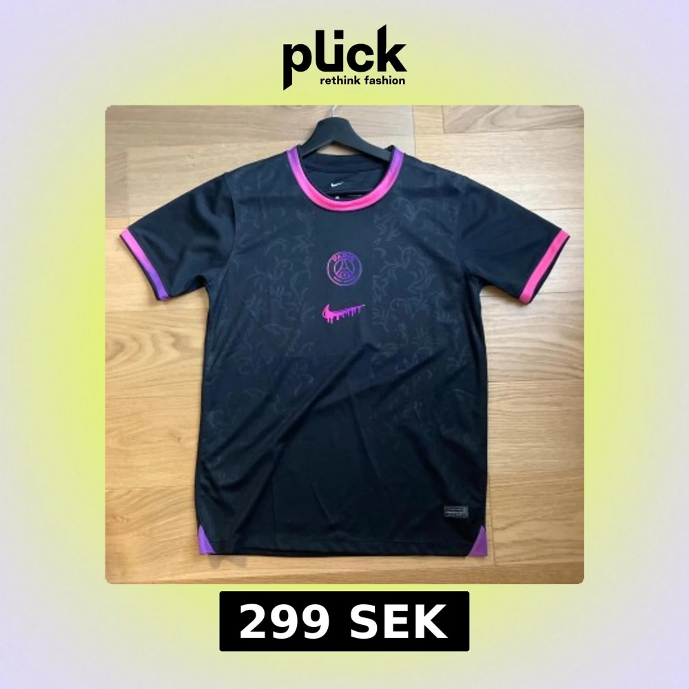 Svart PSG fotbollströja från Nike med lila och rosa detaljer. Tröjan har korta ärmar, diskret blommönster i tyget och en unik rosa Nike-logga med drip-effekt. Tillverkad i Dri-FIT-material som andas, perfekt för träning eller match.