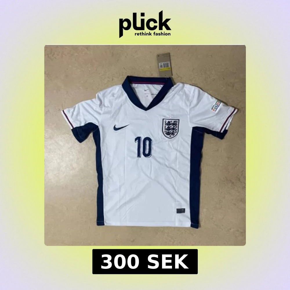 England fotbollströja med Bellingham och nummer 10. Vit med marinblå detaljer, blå Nike-logga och Englands landslagsmärke på bröstet. Kortärmad modell med blå krage och röda/blå ränder på ärmslut. Tillverkad i lätt och ventilerande material.