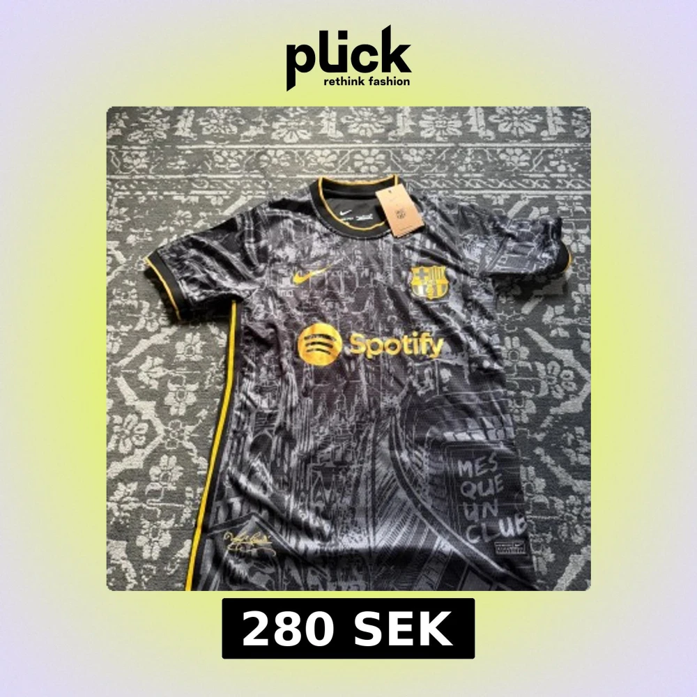 Snygg FC Barcelona fotbollströja från Nike i svart med detaljer i gult. Tröjan har korta ärmar, rund hals och ett unikt grafiskt mönster med Barcelonas stadssilhuett. Officiella klubbmärken, Spotify-logga och UNHCR-tryck. Materialet är lätt och andas, perfekt för träning eller match.