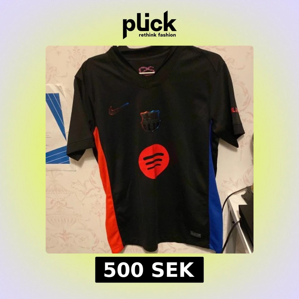 Säljer en svart FC Barcelona fotbollströja från Nike med röd och blå detalj på sidorna. Tröjan har klubbmärke och Nike-logga på bröstet samt röd Spotify-logga. Kortärmad modell, perfekt för fotbollsträning eller match.