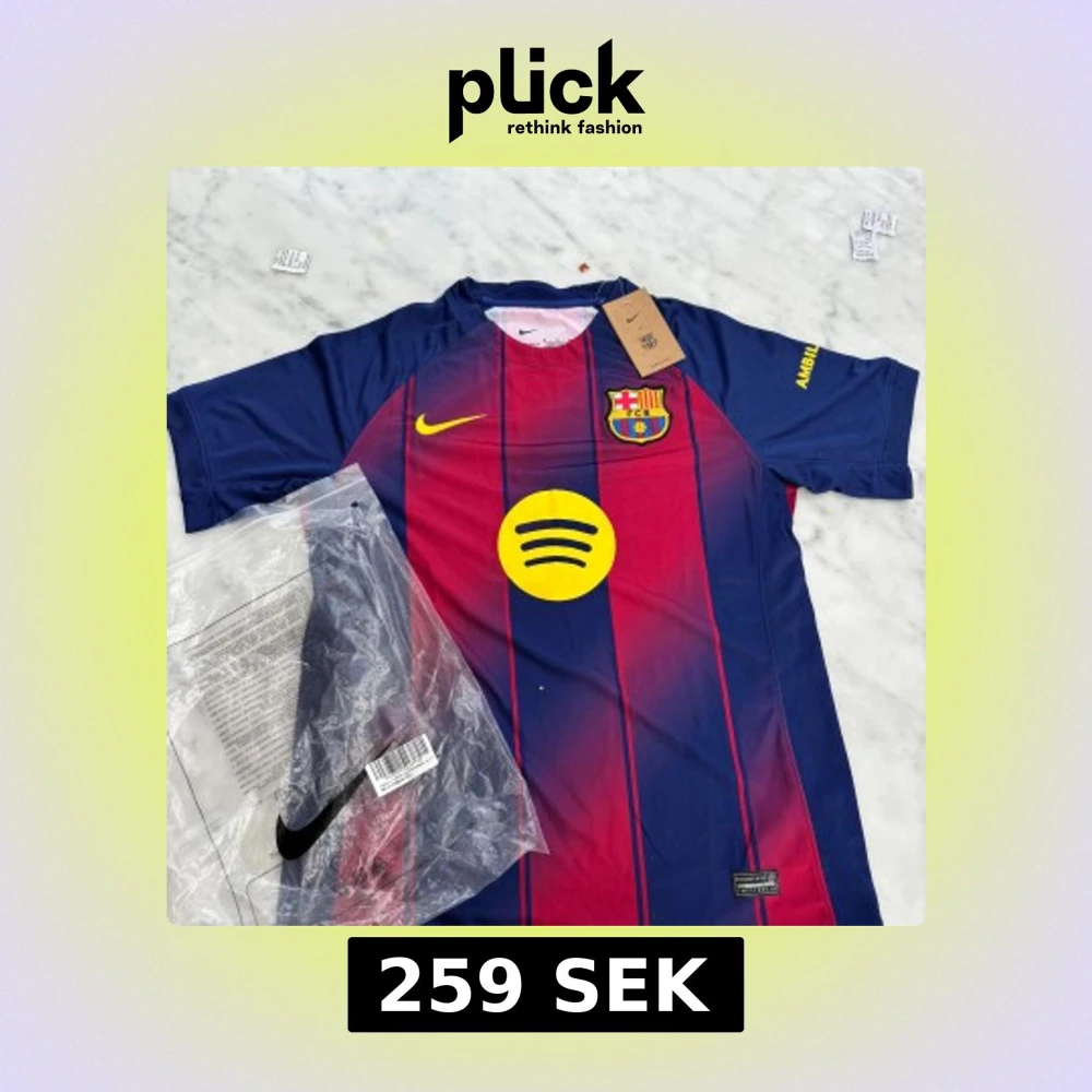Säljer en FC Barcelona fotbollströja från Nike med klassiska blå och röda vertikala ränder, klubbmärke på bröstet och gul Nike-logga. Tröjan har rund hals, korta ärmar och är tillverkad i lätt, ventilerande polyester. Spotify-logga i gult på framsidan.