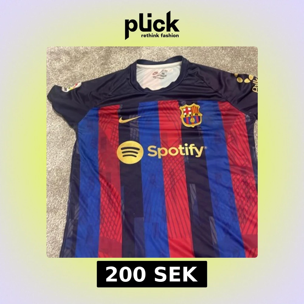 Säljer en officiell FC Barcelona hemmatröja med Lewandowski 9 på ryggen. Tröjan har blå och röda vertikala ränder, klubbmärke på bröstet, Nike-logga och Spotify som sponsor. Materialet är lätt och andas, perfekt för fotboll eller supporterliv.