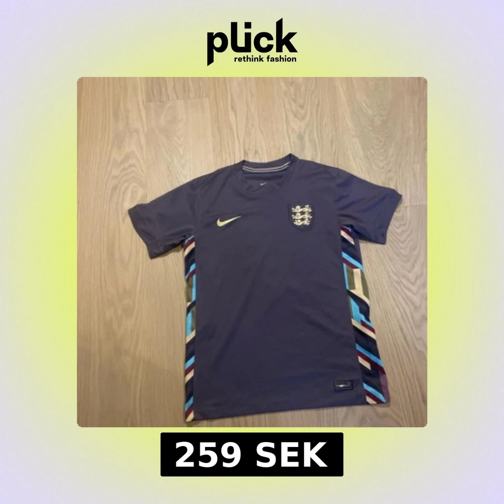 Säljer en England bortatröja från Nike med Bellingham 10 på ryggen. Tröjan är mörklila med färgglada ränder längs sidorna och har det klassiska England-emblemet på bröstet. Perfekt för dig som vill sticka ut på läktaren eller planen.
