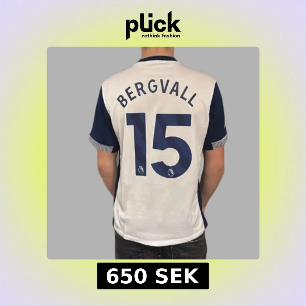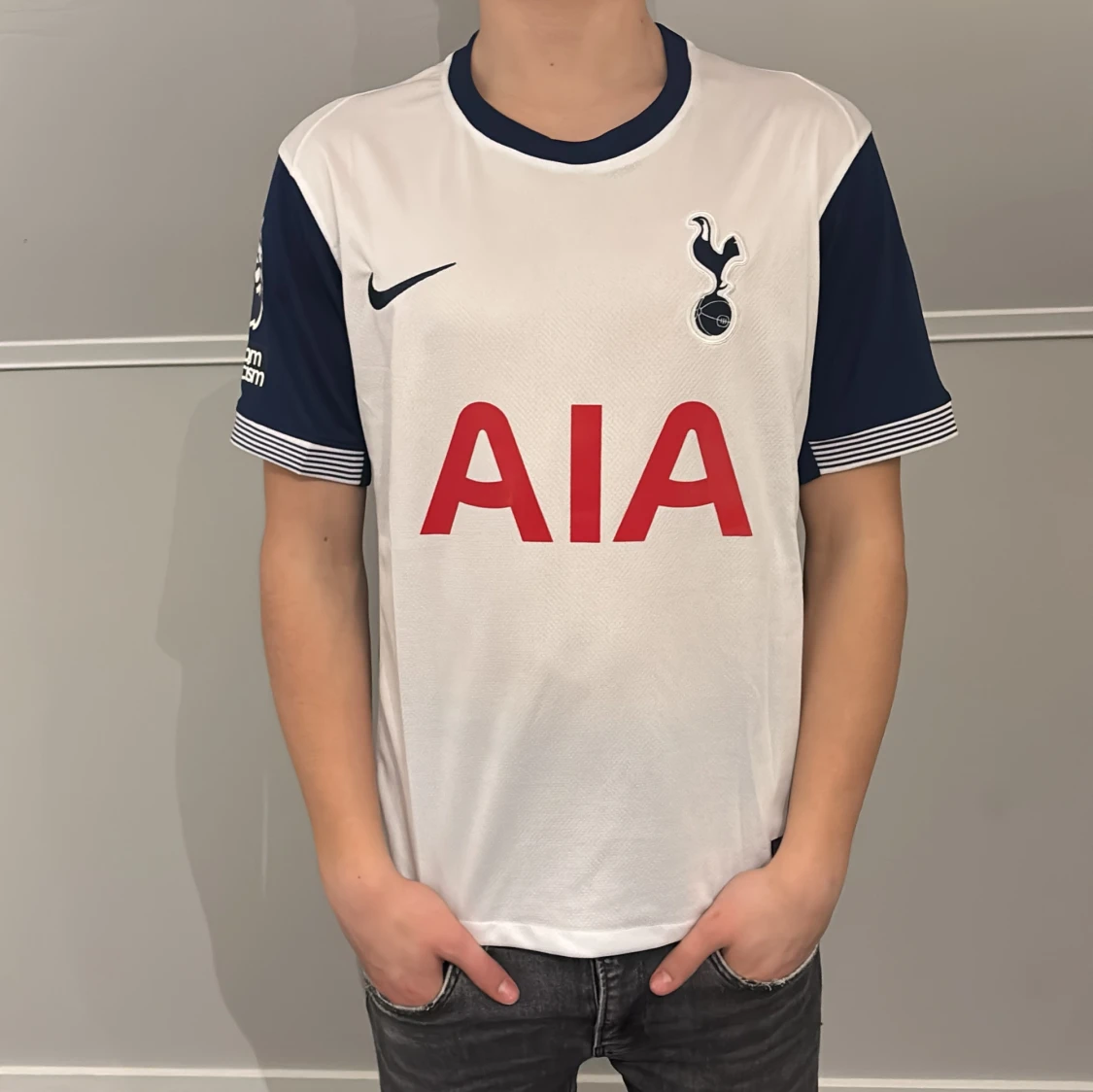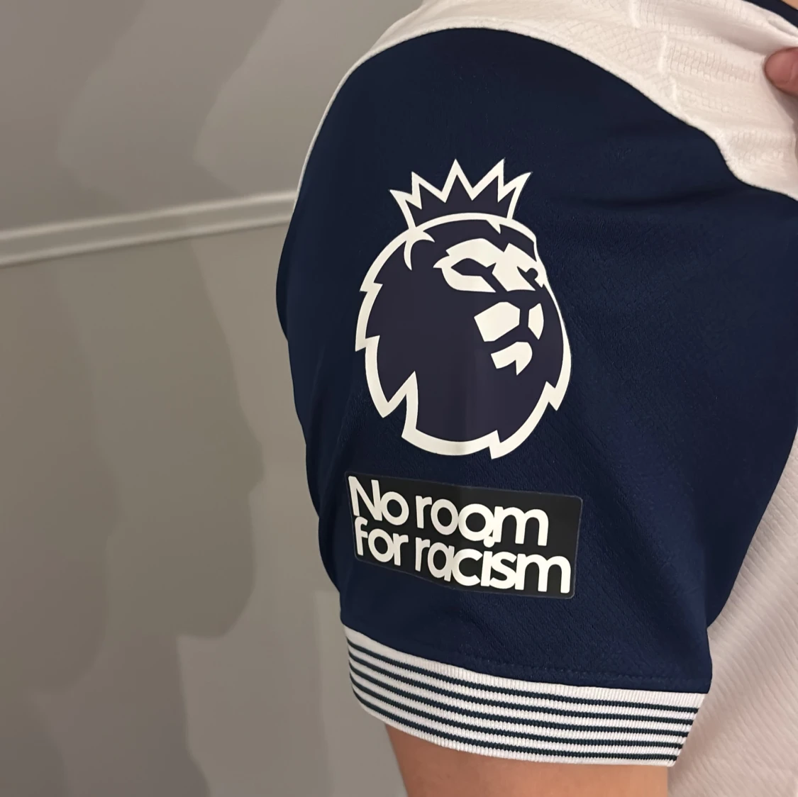 Säljer en vit och blå fotbollströja från Nike med Tottenham Hotspur-logga och AIA sponsortryck. (BERGVALL) Tröjan har korta ärmar med Premier League-märke och texten 'No room for racism'. Perfekt för fans av Spurs! Helt oanvänd