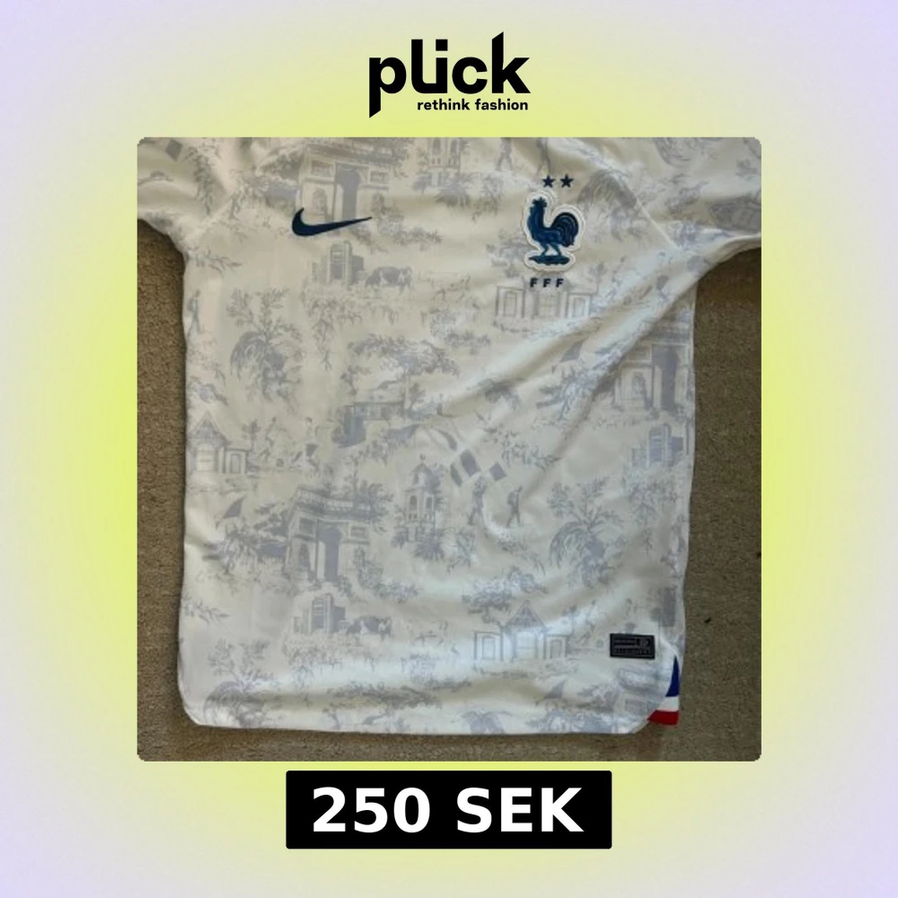 Säljer en officiell Frankrike fotbollströja från Nike i vitt med ljusgrått mönster av franska landmärken och motiv. Broderad tupp-logga och två stjärnor på bröstet, blå Nike-swoosh och trikolor-detalj i nederkant. Tillverkad i lätt och ventilerande material.