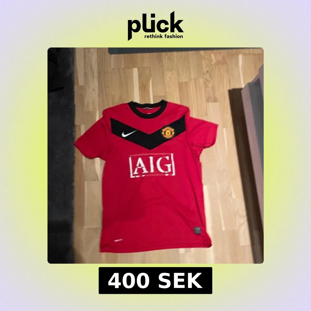 Röd Manchester United fotbollströja från Nike med svart V-formad detalj över bröstet, klubbmärke och AIG-logga framtill. Tröjan har svart krage och är tillverkad i lätt, ventilerande material perfekt för match eller träning.