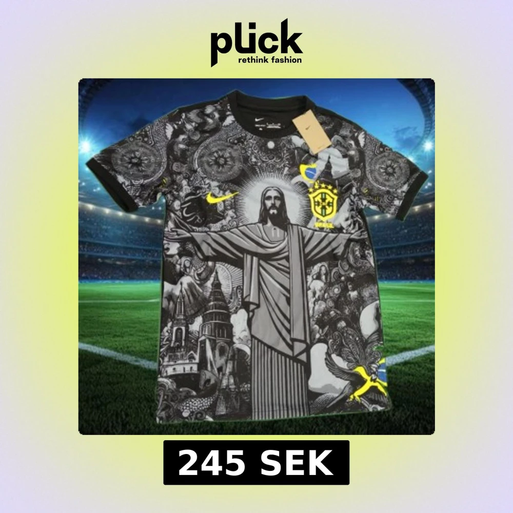 Unik Brasil-fotbollströja från Nike med svart och grått konstnärligt mönster, inklusive Kristusstatyn och brasilianska motiv. Kortärmad med gul Nike-logga och Brasil-märke på bröstet. Perfekt för dig som vill sticka ut på planen eller läktaren.