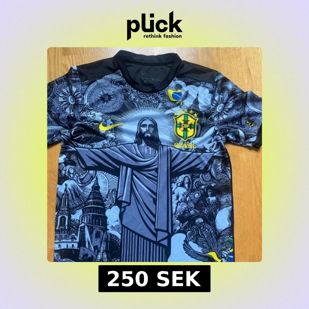 Unik Brasilien CBF fotbollströja från Nike med stor grafisk print av Kristusstatyn och detaljerade illustrationer i svart, grått och blått. Gula broderade loggor och emblem. Kortärmad modell i lätt, ventilerande material. Perfekt för dig som vill sticka ut på planen.
