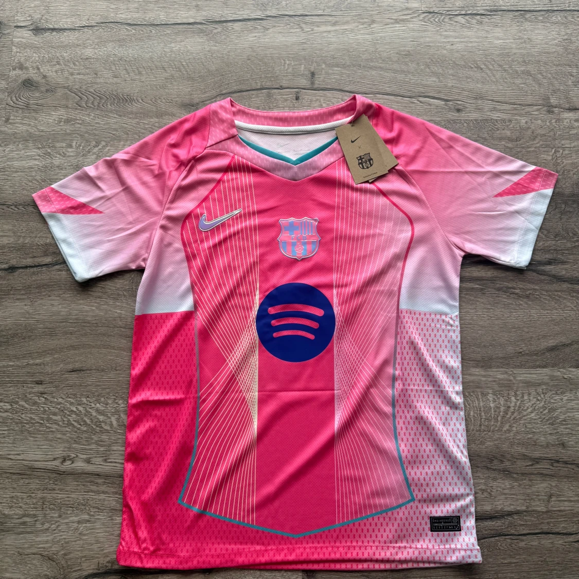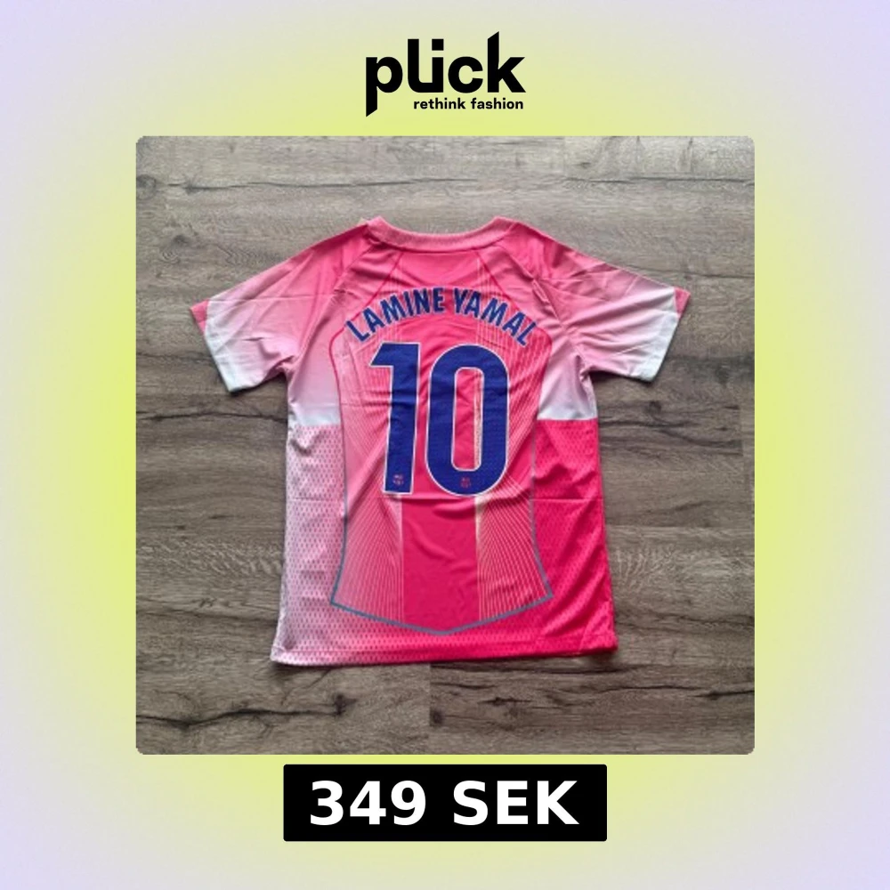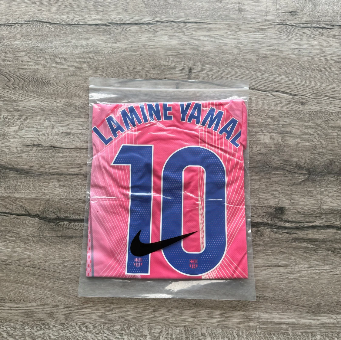 Snygg Barcelona fotbollströja med Lamine Yamal och nummer 10 på ryggen. Tröjan är rosa med vita och blå detaljer, har korta ärmar och coola grafiska linjer. Nike-logga, Spotify-sponsor och Barca-emblem på bröstet. Perfekt för dig som vill sticka ut på planen. Storlek: S helt ny med prislapp. Priset är inte hugget i sten så skicka pm vid funderingar
