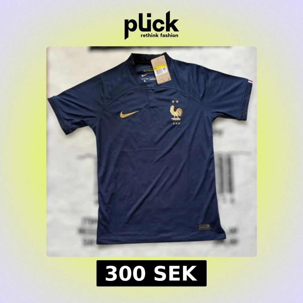 Marinblå officiell Frankrike fotbollströja från Nike med guldiga detaljer, broderad tupp och två stjärnor på bröstet. Tröjan har korta ärmar, liten krage med knapp och är tillverkad i lätt, ventilerande funktionsmaterial. Perfekt för dig som älskar landslagsfotboll.