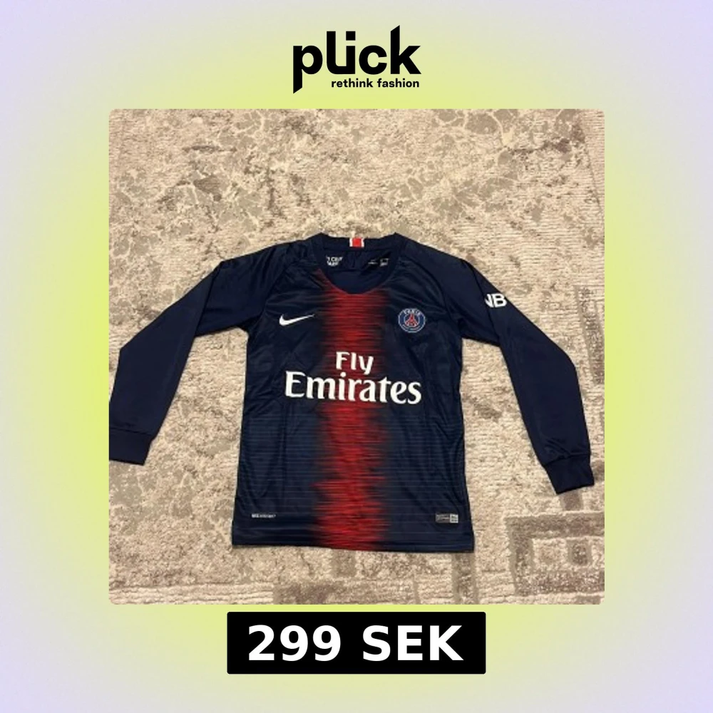 Paris Saint-Germain långärmad fotbollströja från Nike, säsong 2018, med Neymar Jr och nummer 10 på ryggen. Marinblå med röd grafisk rand i mitten, vita tryck och PSG-emblem på bröstet. Materialet är lätt och andas, perfekt för träning. Ni can rekommendera vilken pris ni vill ha den för.