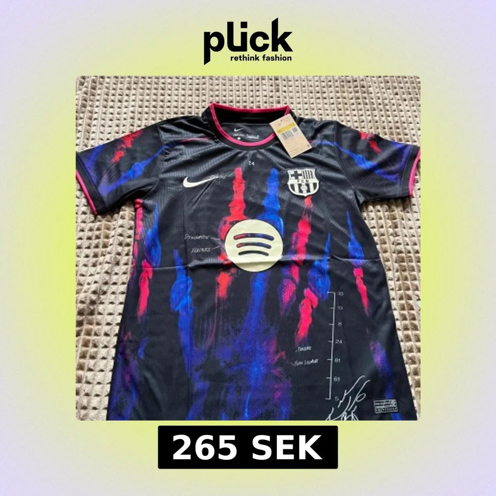 Snygg FC Barcelona matchtröja från Nike i svart med färgstarka röda och blå penseldrag, Spotify-logga på bröstet och klubbmärke. Kortärmad modell i lätt och ventilerande Dri-FIT-material. Unik design med detaljer och tryck inspirerade av konst och sport.