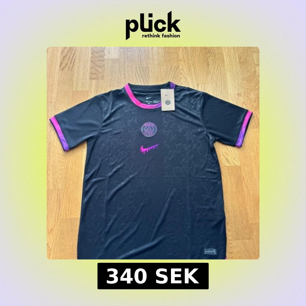 Svart Paris Saint-Germain fotbollströja från Nike med lila och rosa detaljer på krage och ärmslut. Tröjan har korta ärmar, diskret blommönster i tyget och PSG-logga samt Nike swoosh i rosa framtill. Tillverkad i lätt Dri-FIT material som andas.