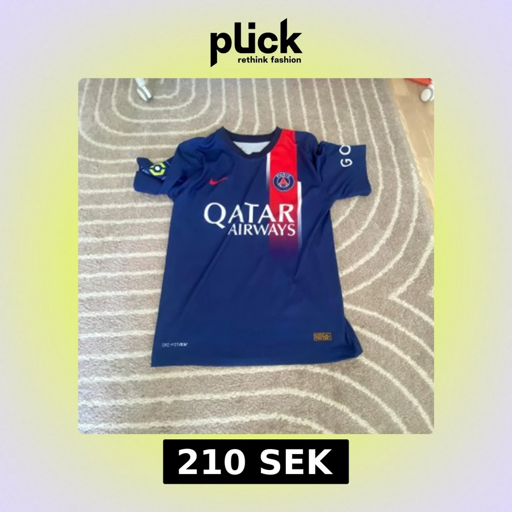 Säljer en blå Paris Saint-Germain fotbollströja med Mbappé #7 på ryggen. Tröjan har röd och vit rand på framsidan, Qatar Airways sponsortryck och PSG-emblem på bröstet. Korta ärmar och tillverkad i lätt funktionsmaterial.