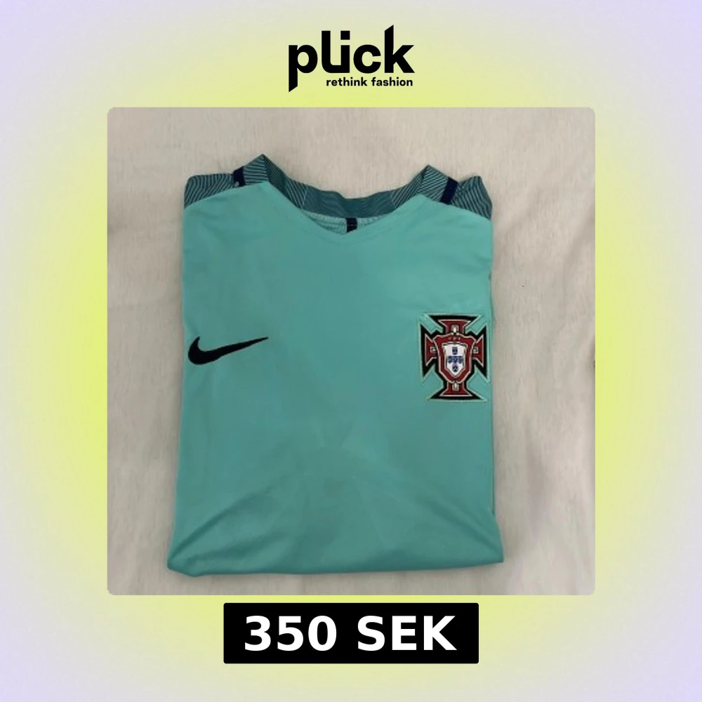 Säljer en Portugal fotbollströja från Nike i ljusgrön färg med svarta detaljer och broderat landslagsmärke på bröstet. Tröjan har korta ärmar och är tillverkad i ett lätt och ventilerande material. Perfekt för fotbollsträning eller att bära som supporter.
