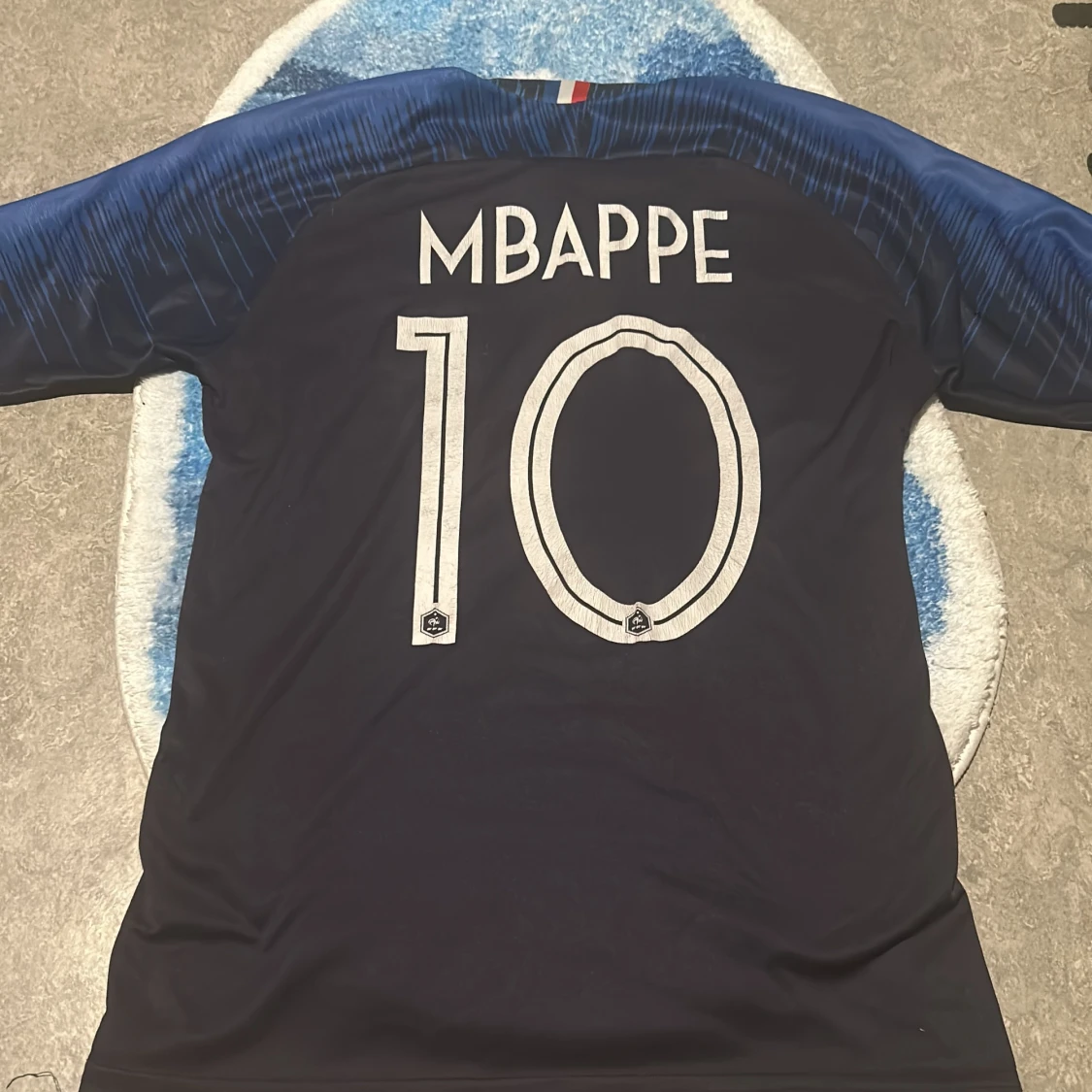 Säljer en blå fotbollströja från Nike med nummer 10 och texten 'MBAPPE' på ryggen. Tröjan har korta ärmar och FFF-loggan på bröstet. Perfekt för fotbollsfans!