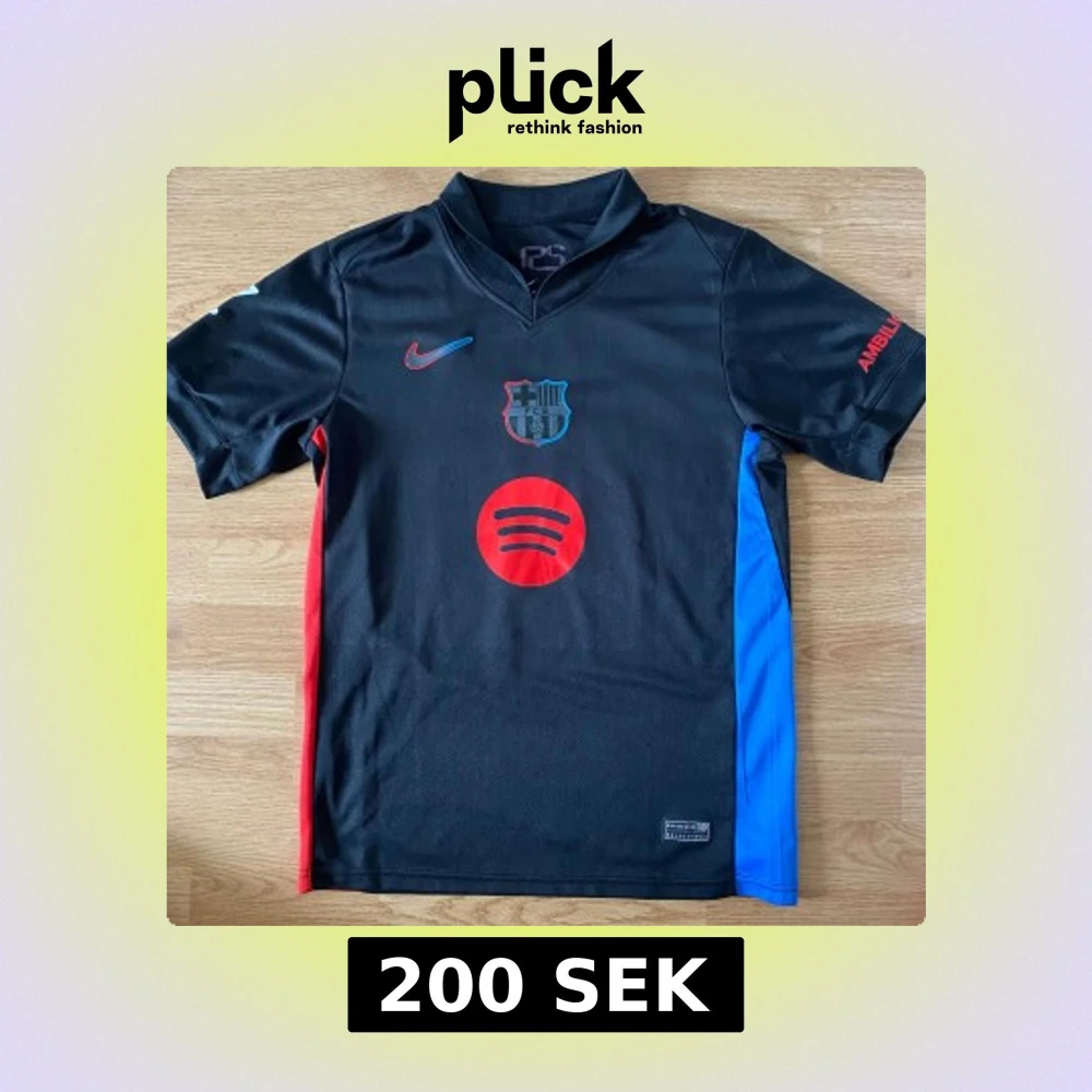 Säljer en svart FC Barcelona bortatröja från Nike med Lamine Yamal 19 på ryggen. Tröjan har röda och blå detaljer på sidorna, klubbmärke och sponsortryck på bröstet samt UNHCR-logga bak. Kortärmad och tillverkad i Dri-FIT-material. För optimal kvalité och feel. För ENDAST 200kr så kan du få den bästa fotbollströja för det bästa priset! I storlek S, pris kan diskuteras!