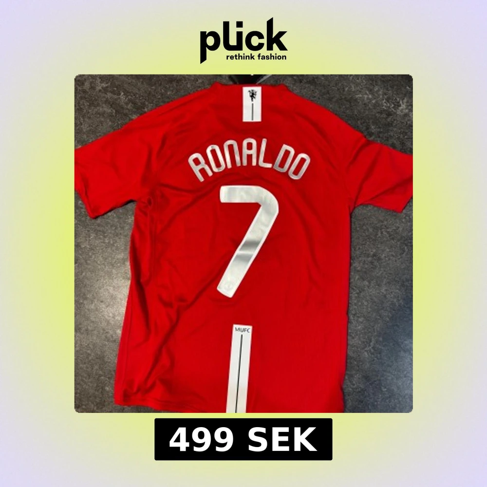 Röd Manchester United fotbollströja med Ronaldo och nummer 7 på ryggen. Champions League-märke på ärmen, AIG sponsortryck och klubbmärke fram. Nike-logga och detaljer i vitt. Perfekt för fans av Ronaldo och United.