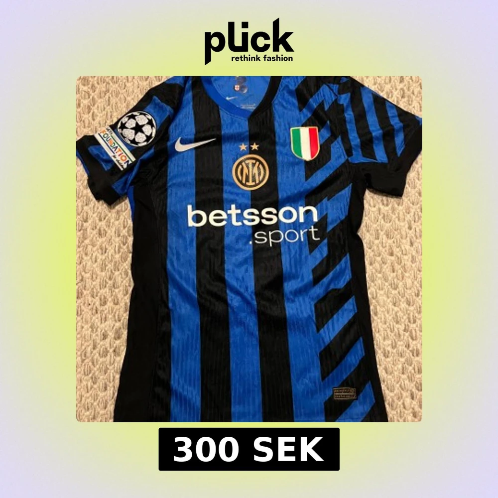 Inter Milan fotbollströja med Calhanoglu #20, tillverkad av Nike i lätt och ventilerande material. Klassisk blå och svart randig design med klubbmärke, sponsorer och Champions League-märke på ärmen. Kortärmad modell med snygga detaljer och guldinslag på sidorna.