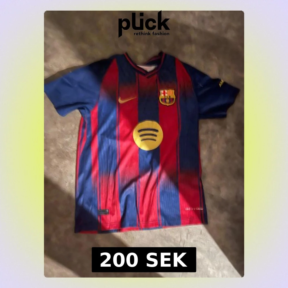 Säljer en FC Barcelona matchtröja från Nike med klassiska röda och blå vertikala ränder. Tröjan har klubbmärket, gul Nike-logga och Spotify som sponsor framtill, samt UNHCR-logga på ryggen. Kortärmad och tillverkad i lätt polyester för maximal komfort på planen.