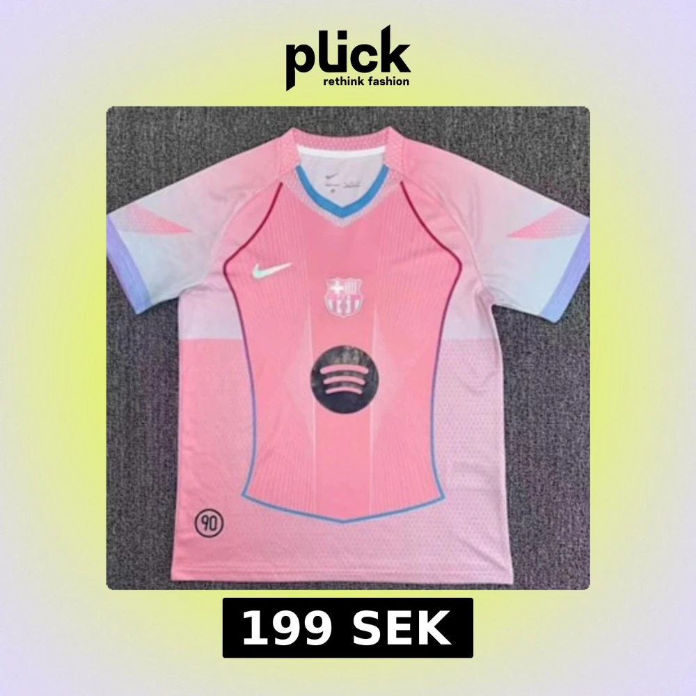 Säljer en rosa FC Barcelona fotbollströja från Nike med klubbmärke och Spotify-logga på bröstet. Tröjan har korta ärmar, ljusblå detaljer och ett sportigt snitt. Materialet är lätt och andas, perfekt för träning eller match.