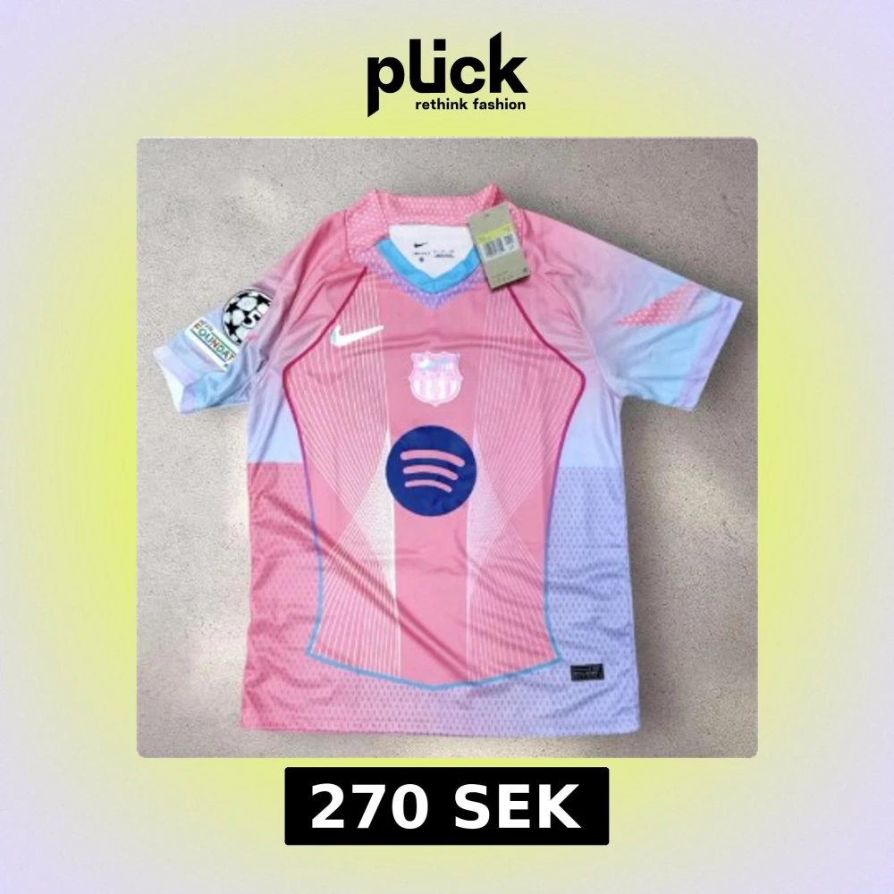 Snygg FC Barcelona fotbollströja från Nike i rosa och ljusblå toner med vita detaljer. Kortärmad modell med klubbmärke, Spotify-logga och Champions League-märke på ärmen. Modern design med grafiska linjer och mönster, perfekt för dig som vill sticka ut på planen.