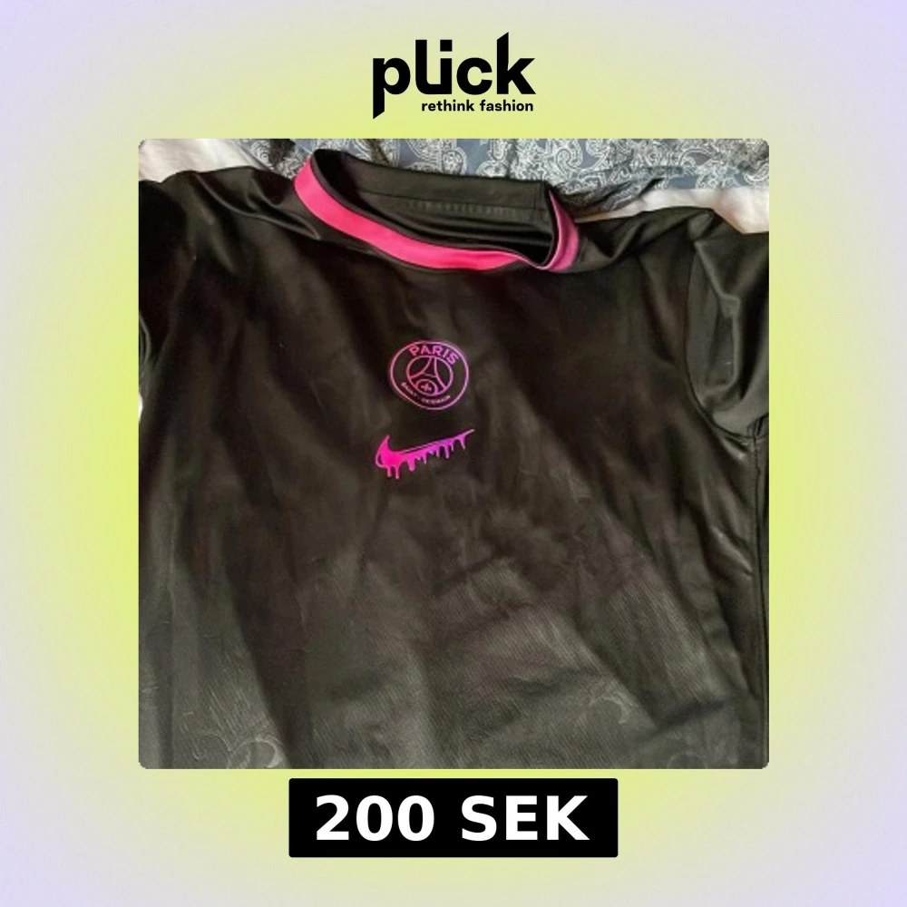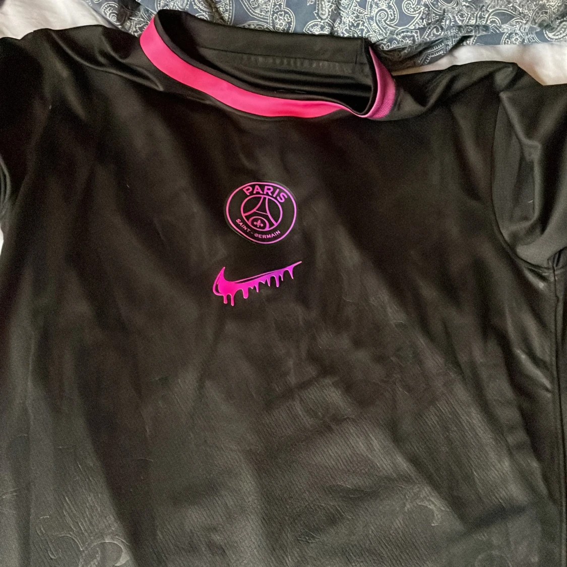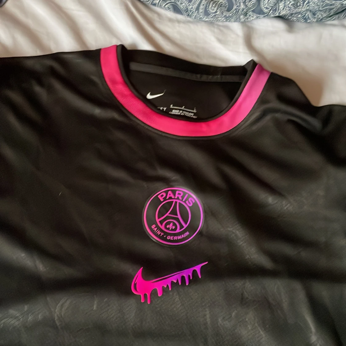 Svart PSG fotbollströja från Nike med Dri-Fit material. Tröjan har korta ärmar, rosa detaljer vid kragen och ett rosa PSG-emblem samt Nike-logga med drip-effekt på bröstet. Snyggt mönster i tyget och trycket 'G10' på ryggen. Perfekt för dig som gillar streetstyle och fotboll.