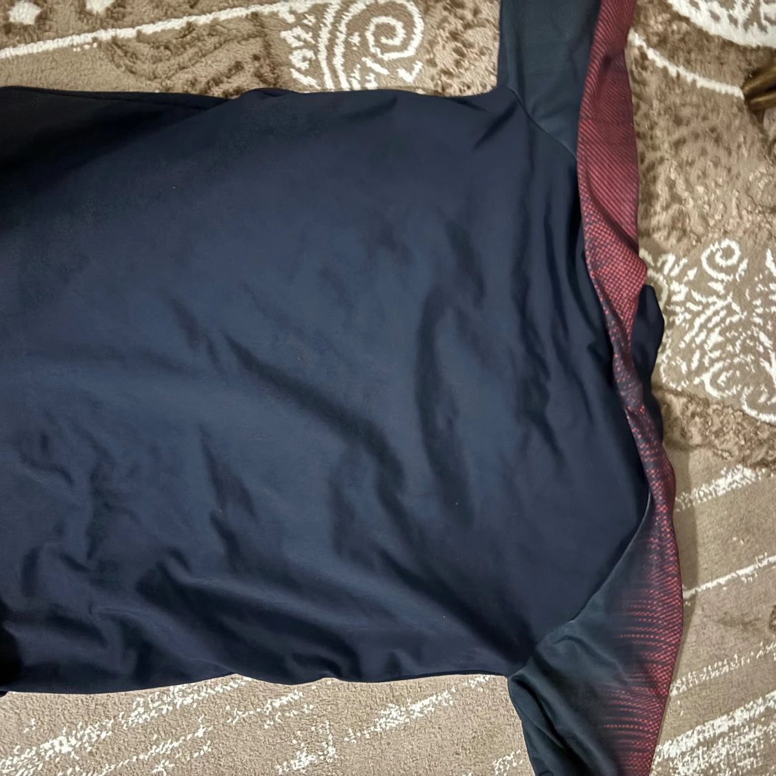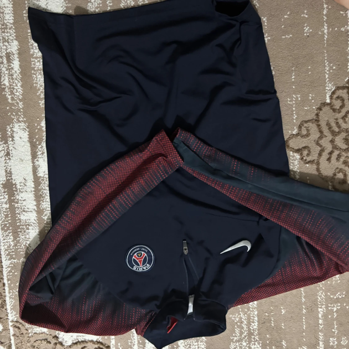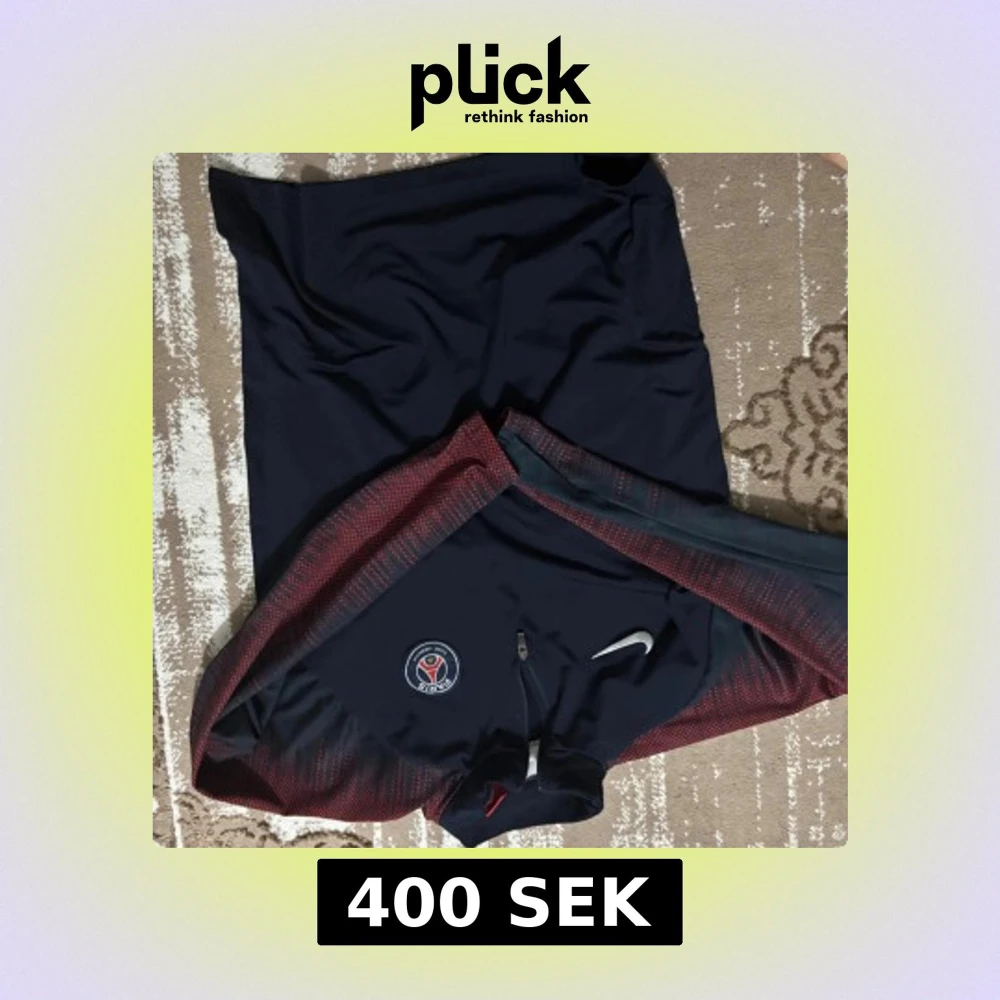 Mörkblå långärmad fotbollströja från Nike med PSG-logga på bröstet och halv dragkedja. Ärmarna har röda detaljer i ett diskret mönster. Tillverkad i ett lätt och sportigt material som andas, perfekt för träning eller match.