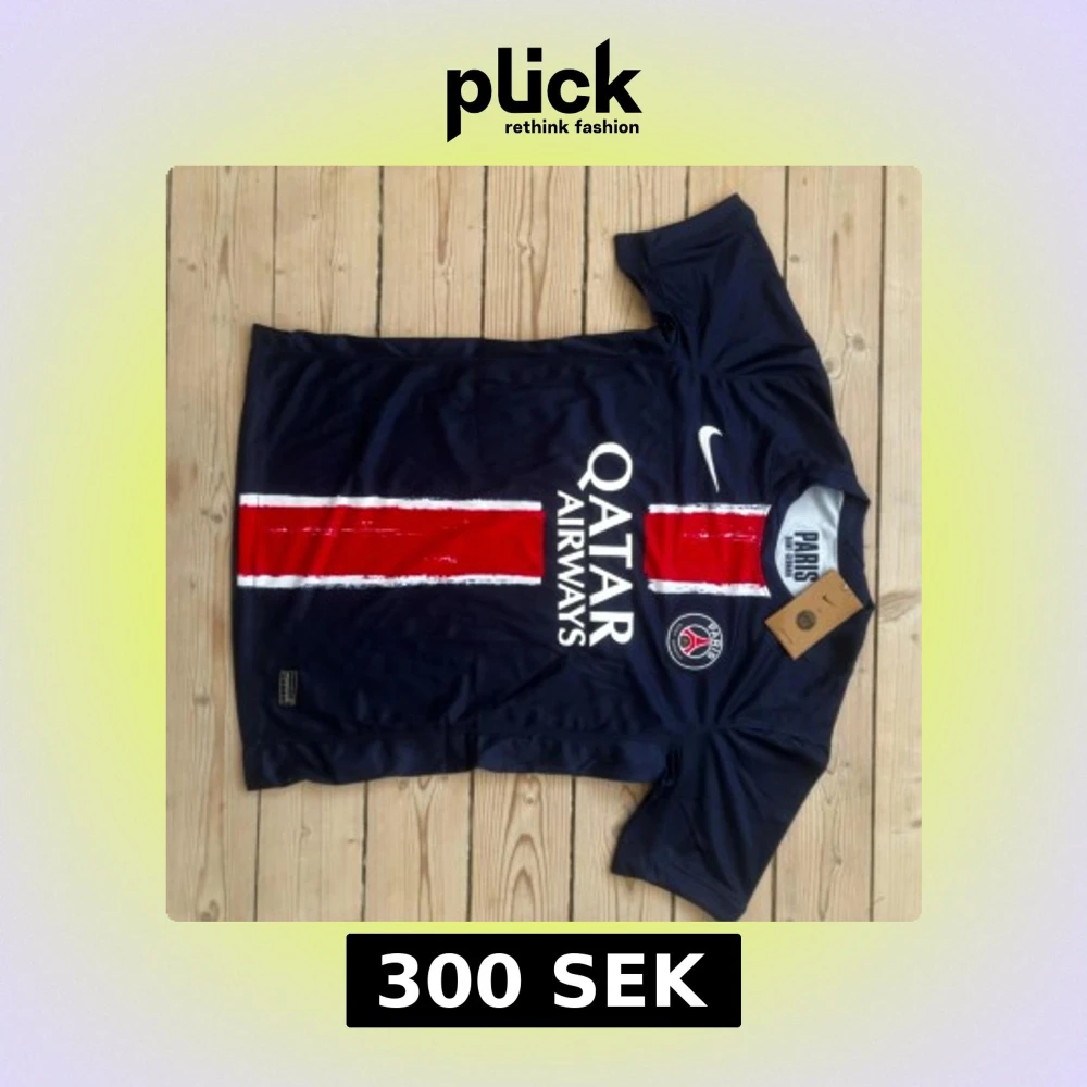Paris Saint-Germain fotbollströja från Nike i Dri-FIT-material. Djupblå med röd vertikal rand och vita detaljer, PSG-logga och Qatar Airways-tryck på bröstet. Kortärmad modell, perfekt för match eller träning.