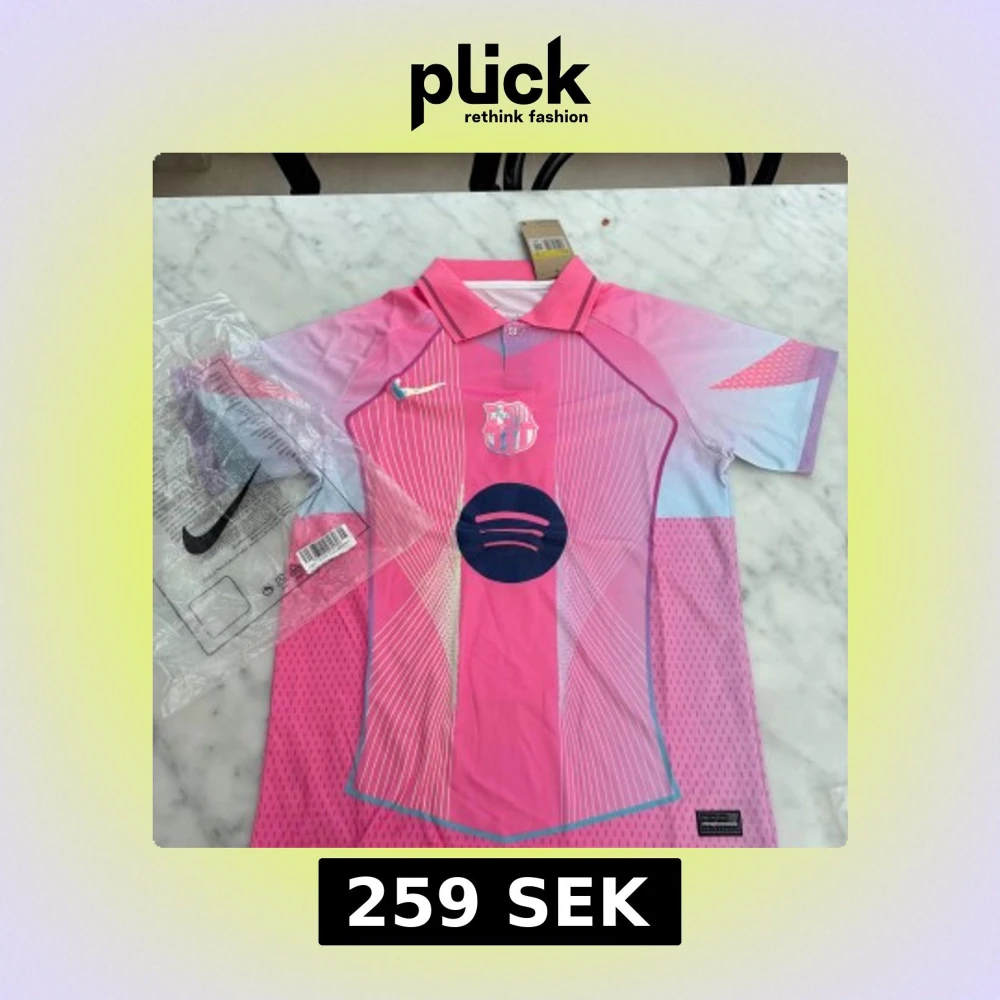 Säljer en Barcelona fotbollströja från Nike i storlek S. Tröjan har en snygg rosa bas med ljusblå och lila detaljer, vita linjer och klubbmärke på bröstet. Klassisk krage och korta ärmar. Materialet är lätt och andas, perfekt för träning eller match.