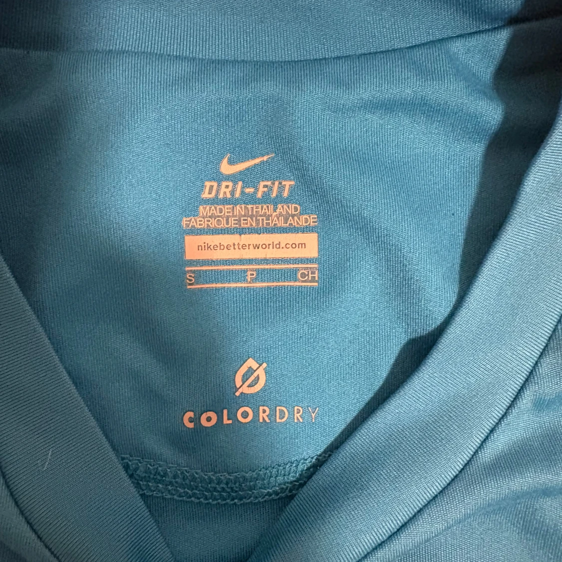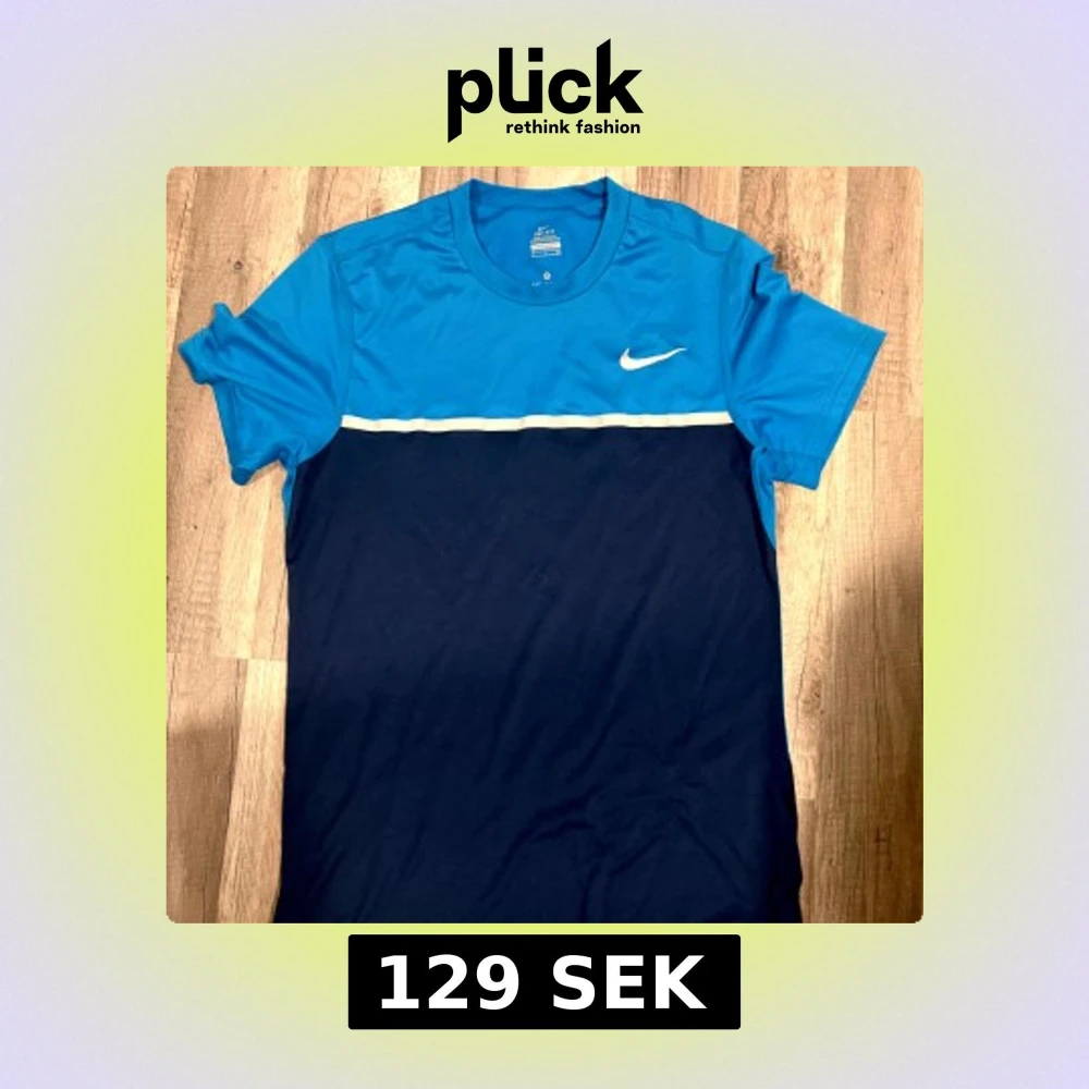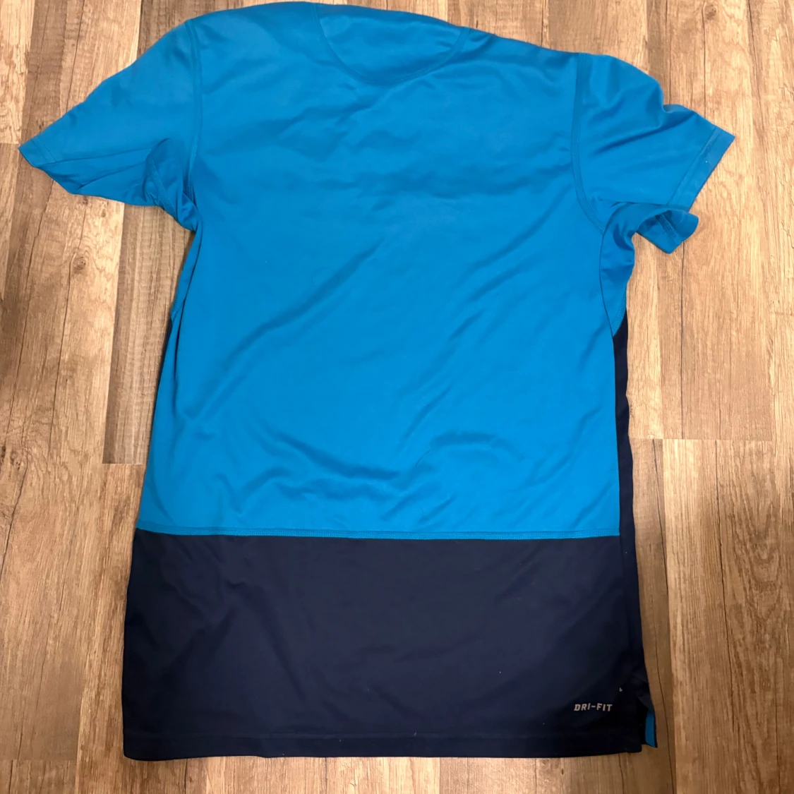 Nike Dri-Fit t-shirt i sportig design med ljusblå överdel och mörkblå nederdel, avdelad med en vit linje över bröstet. Klassisk Nike-logga på bröstet. Tillverkad i lätt och snabbtorkande polyester, perfekt för träning eller tennis.