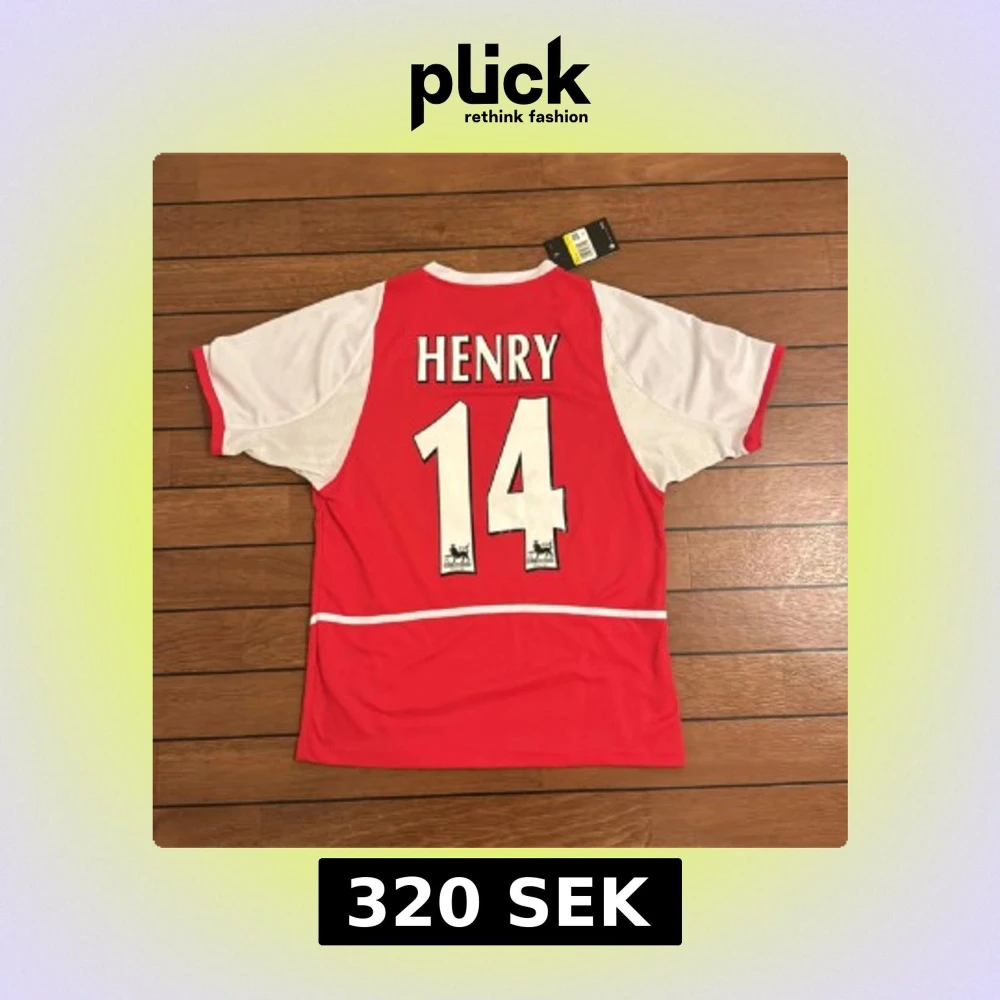 Säljer en klassisk Arsenal fotbollströja med Henry 14 på ryggen. Röd kropp med vita korta ärmar, vit krage och detaljer. Nike Dri-FIT material för skön känsla och ventilation. Arsenal klubbmärke och O2 sponsor på bröstet. Perfekt för dig som älskar fotboll och retrostil.
