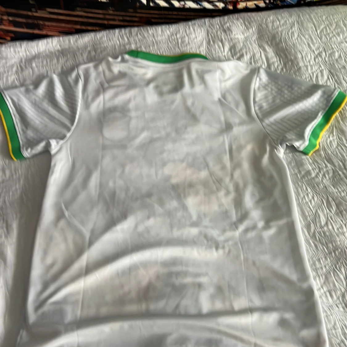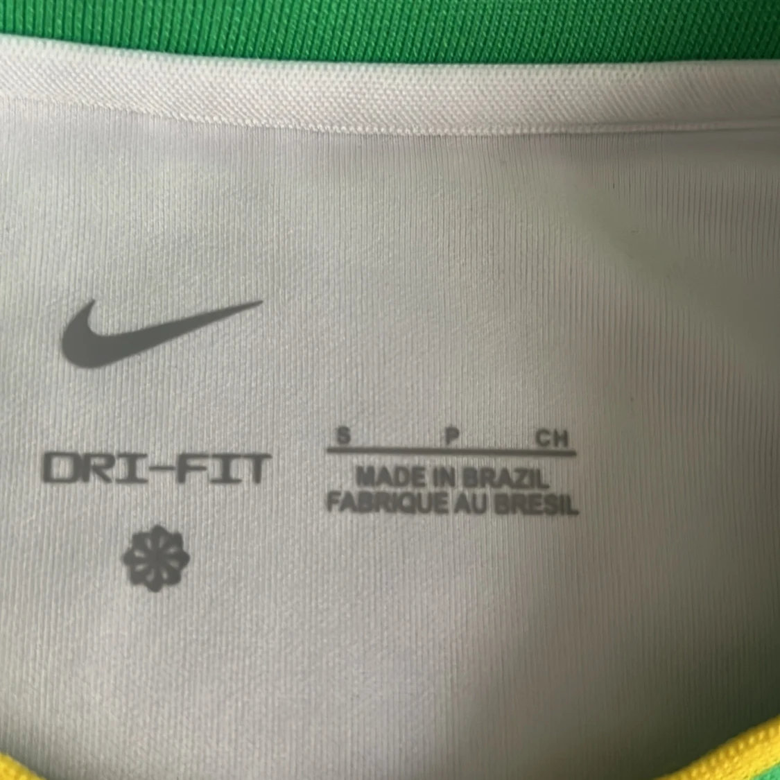 Snygg vit Brasilien fotbollströja från Nike i Dri-FIT-material. Tröjan har korta ärmar, gröna och gula detaljer på krage och ärmslut samt stora gula fåglar tryckta framtill. Brasilien-emblem på bröstet och Nike-logga. Perfekt för dig som älskar fotboll och vill sticka ut.T-shirten är ej andvänd