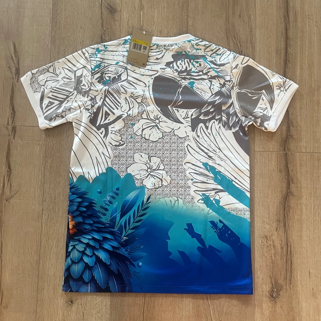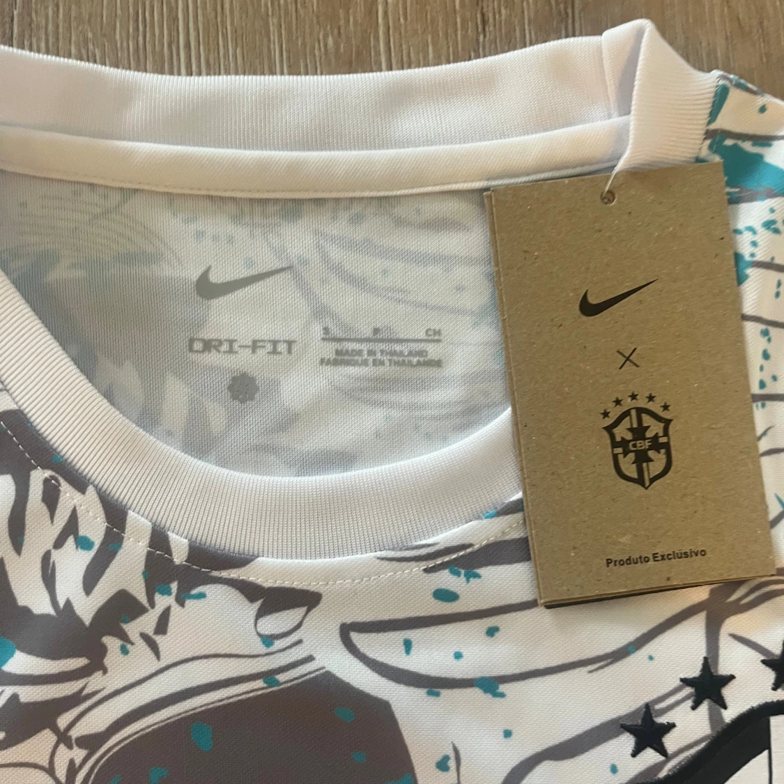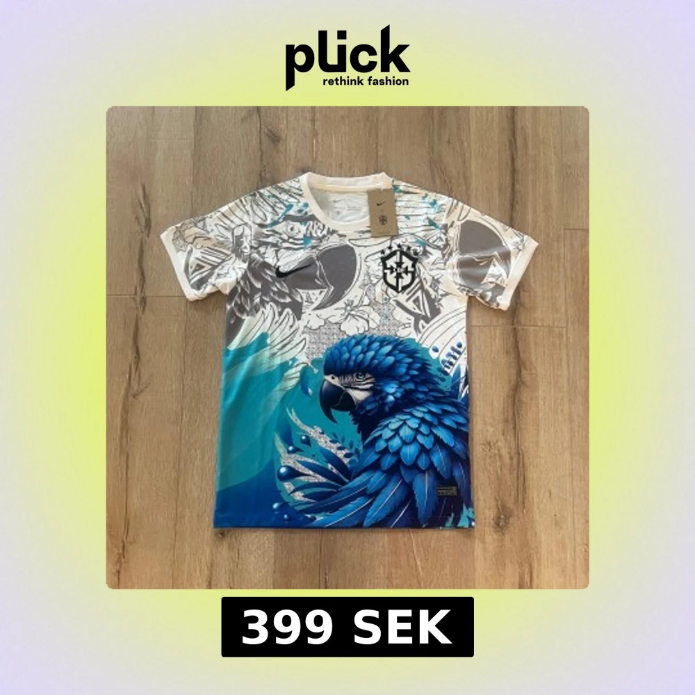 Unik t-shirt från Nike x CBF med ett stort, detaljerat blått papegojtryck och grafiska mönster i grått och vitt. Kortärmad modell i lätt polyester Dri-Fit material som andas. Snyggt CBF-emblem på bröstet och coola kontrasterande färger som sticker ut.