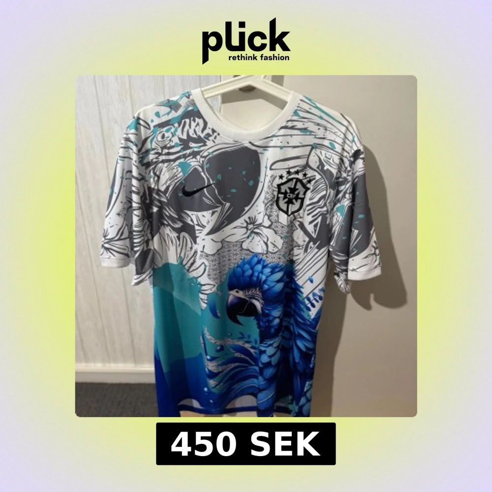 Unik Brasilien fotbollströja från Nike med Raphinha #11 på ryggen. Tröjan har ett färgstarkt tryck med blå papegoja, blommor och CBF-emblem på bröstet. Färgerna går i vitt, grått, blått och turkost. Tillverkad i lätt och ventilerande material, perfekt för match eller träning.