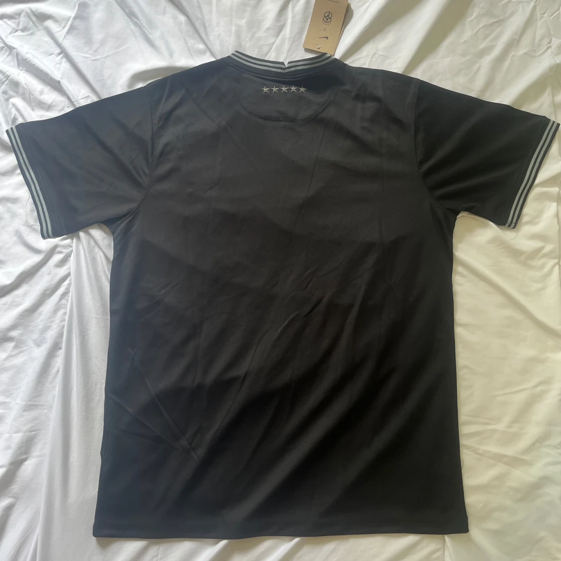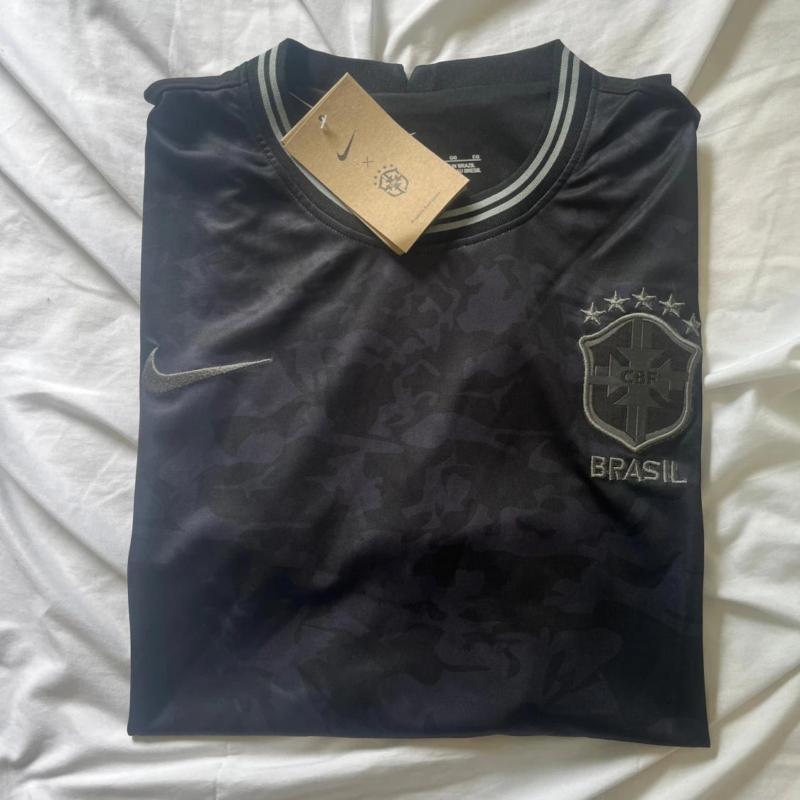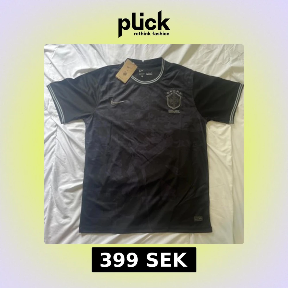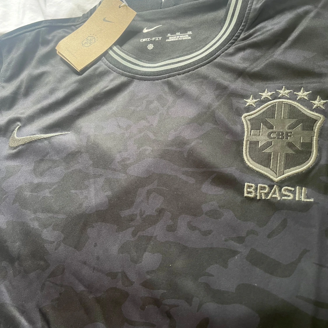 Säljer en svart Brasilien fotbollströja från Nike med diskret camomönster och broderat klubbmärke på bröstet. Tröjan har korta ärmar och ribbade detaljer vid hals och ärmslut. Perfekt för dig som vill sticka ut på planen.