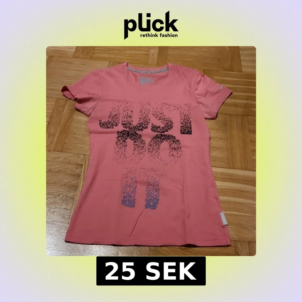 Nike Dri-Fit t-shirt i bomull, rosa färg med svart och blått tryck 'JUST DO IT' på framsidan. Kortärmad och figurnära passform, perfekt för träning eller chill. Skön och lätt känsla tack vare materialet.