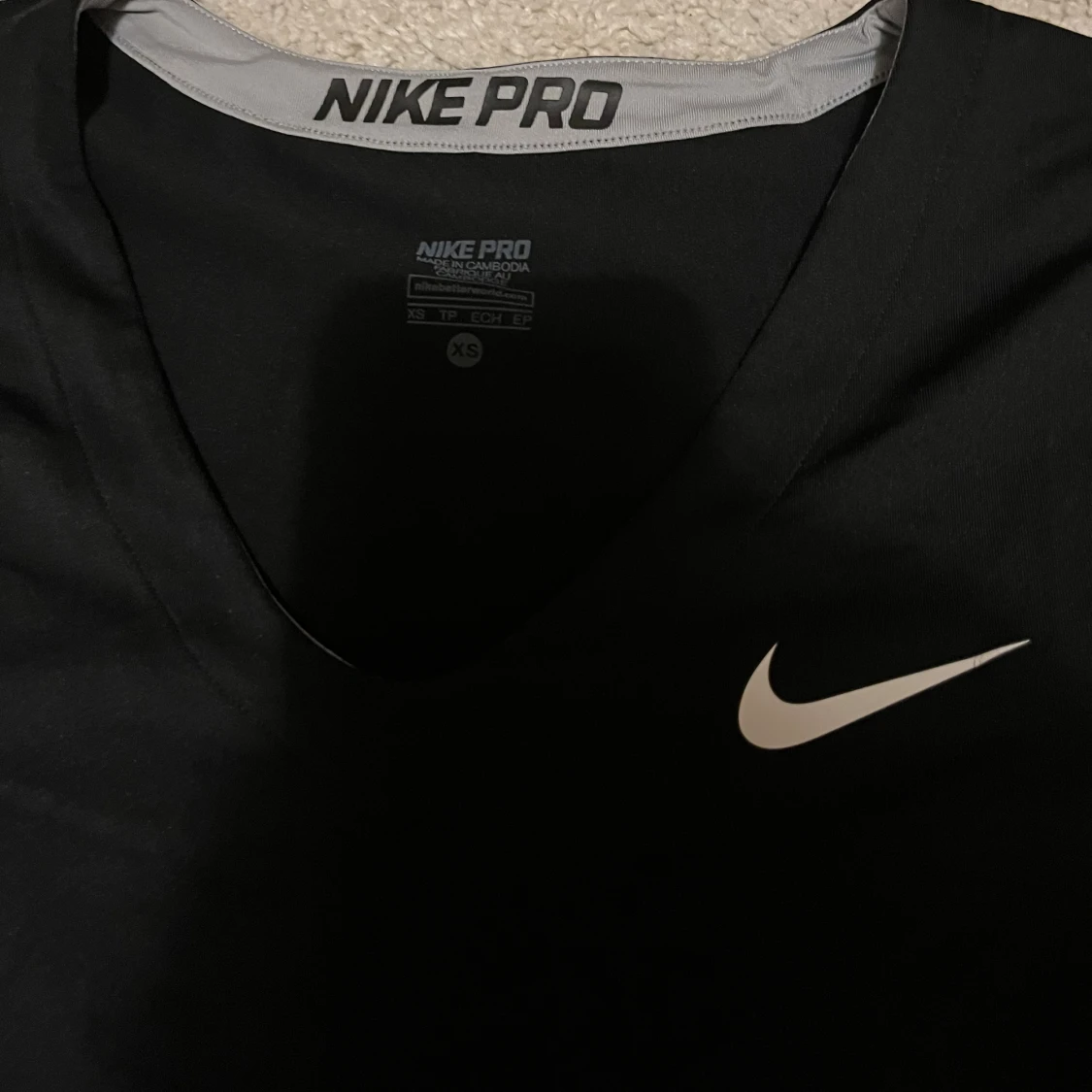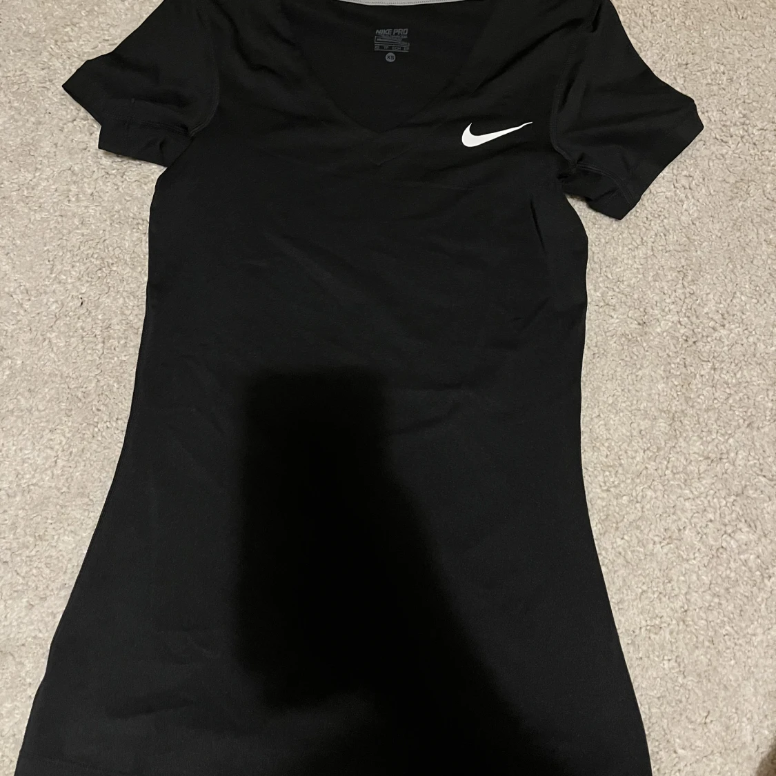 En träningstshirt från Nike pro som enbart är använd ett fåtal gånger! Supermjukt och glansigt material och i strl Xs. En slimfit modell med v-ringning 🥰